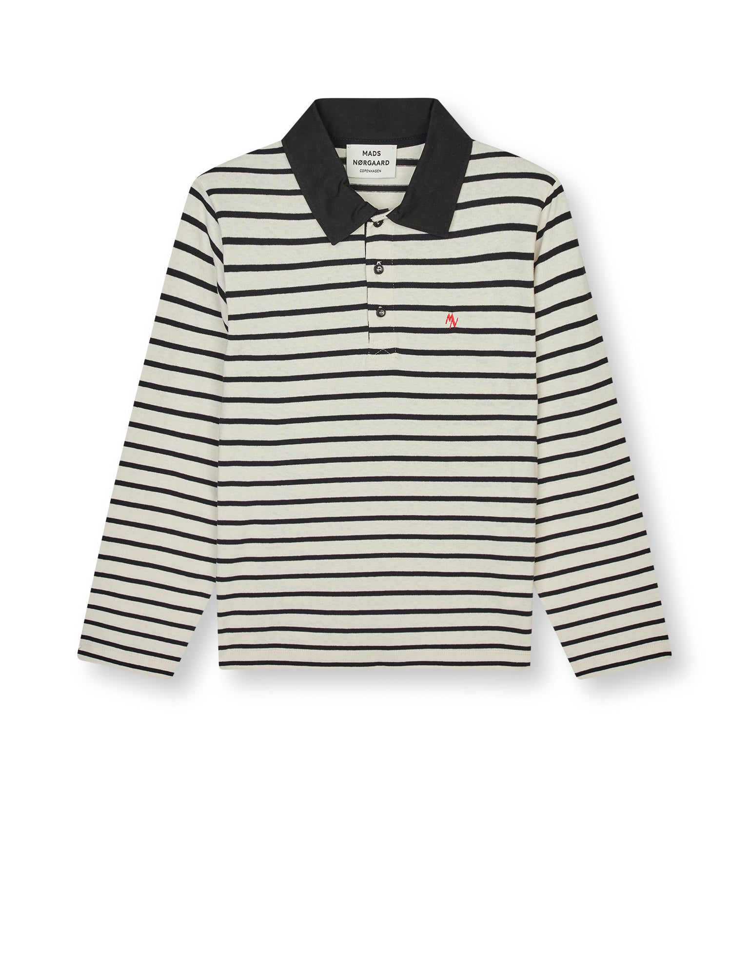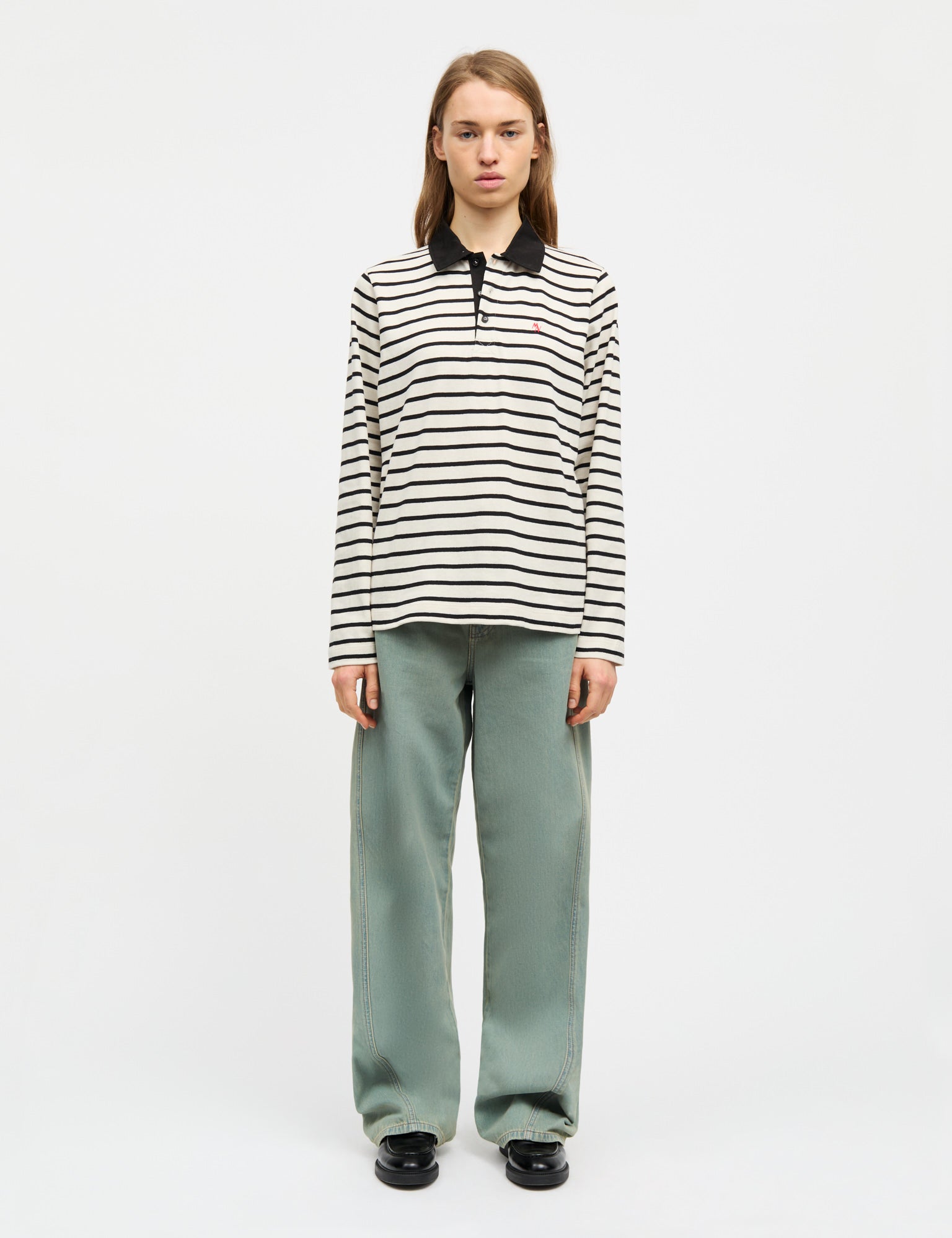 Løs, langærmet poloshirt med stolpelukning og lille initial-logo broderet på brystet.