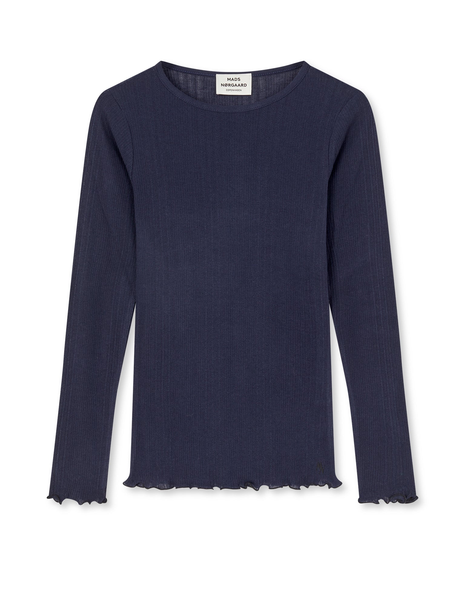 Tætsiddende og stretchy T-shirt med rund hals, lange ærmer og krøllede kanter.