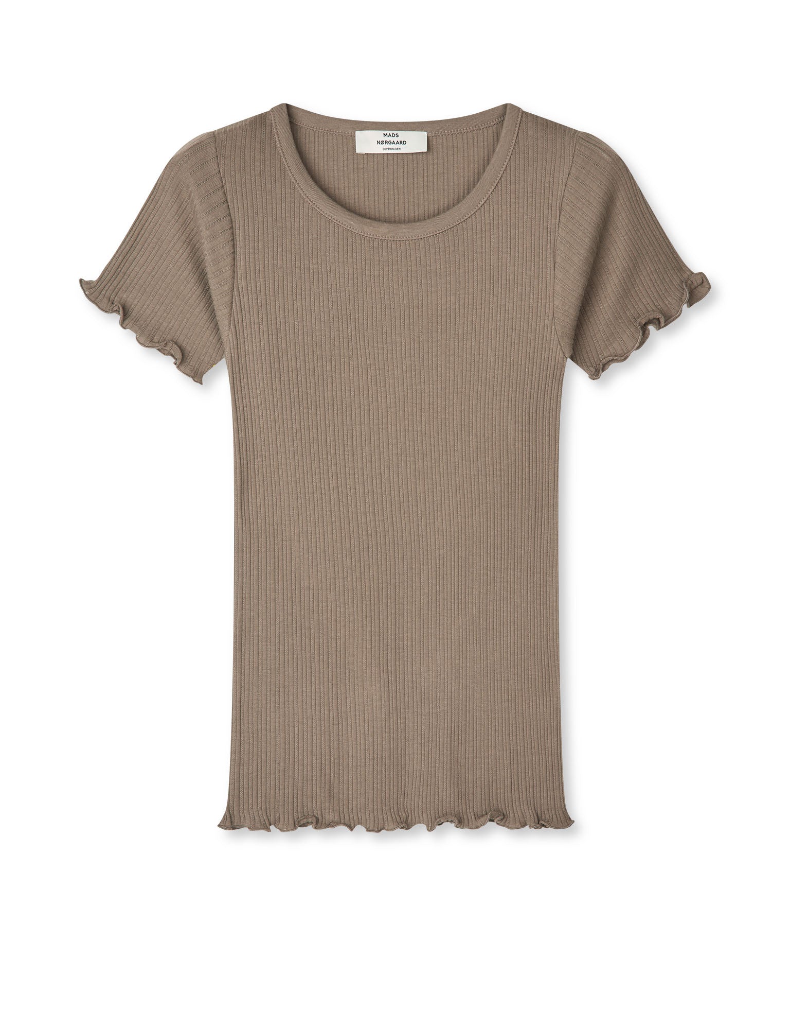 Tætsiddende ribbet T-shirt med korte ærmer, afrundet halsudskæring og bølget kant ved ærmer og nederste kant.