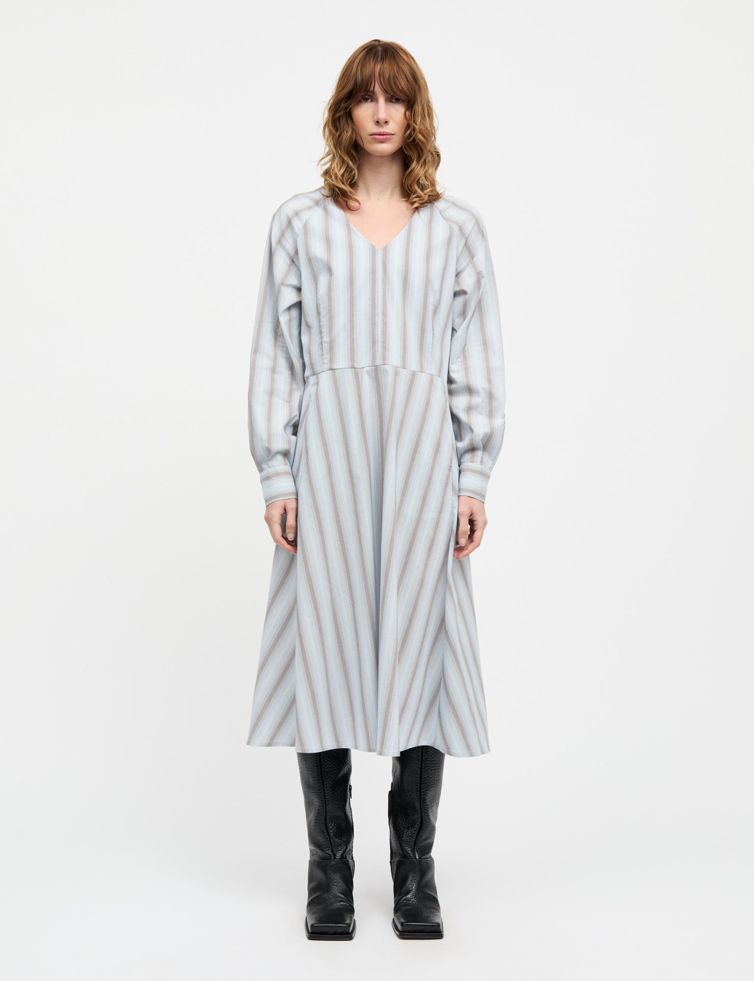 Læglang kjole med lange ærmer med manchetter, A-facon og V-udskæring.