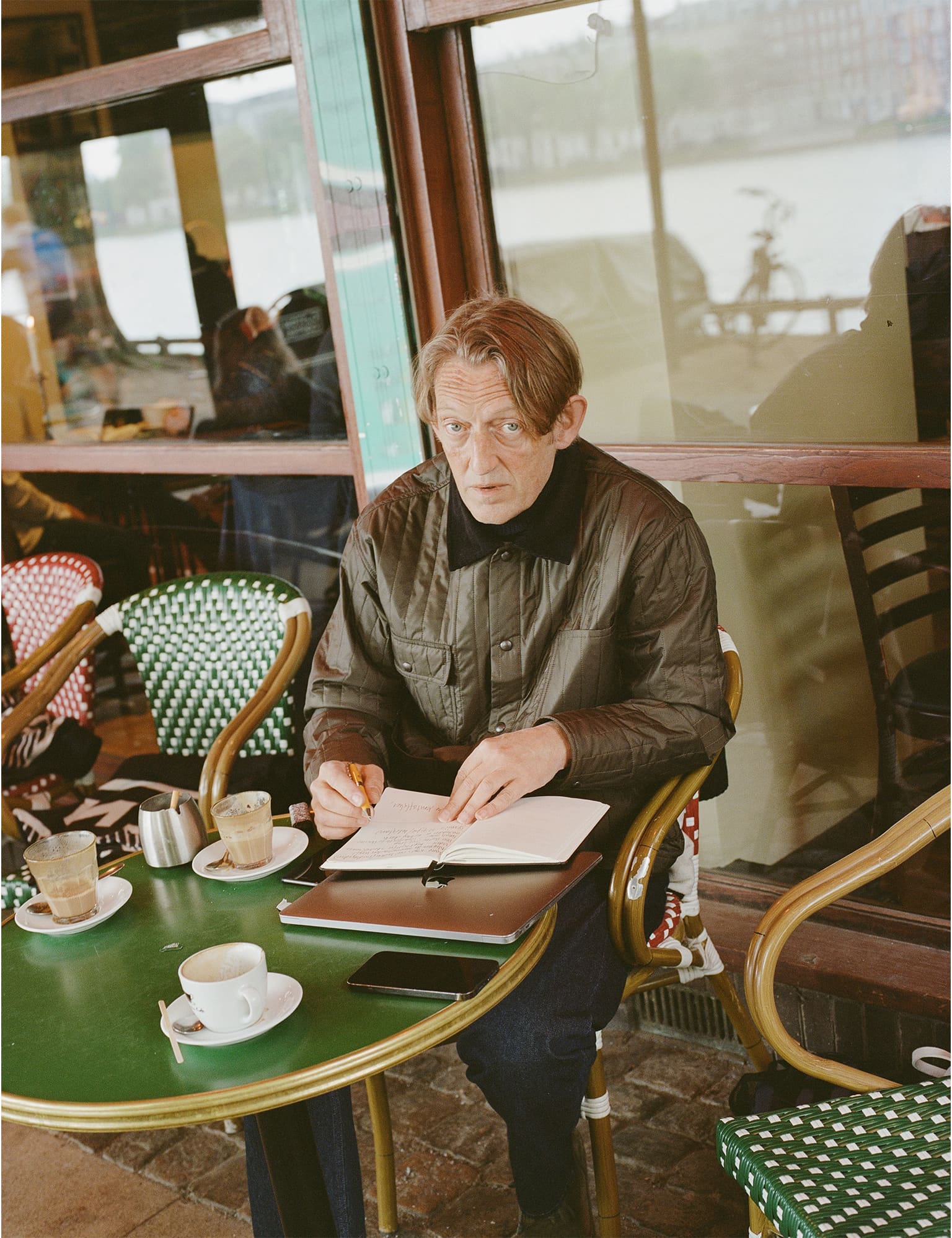 Glat termojakke med knapper, cut-away fløjlskrave og fire udvendige lommer.