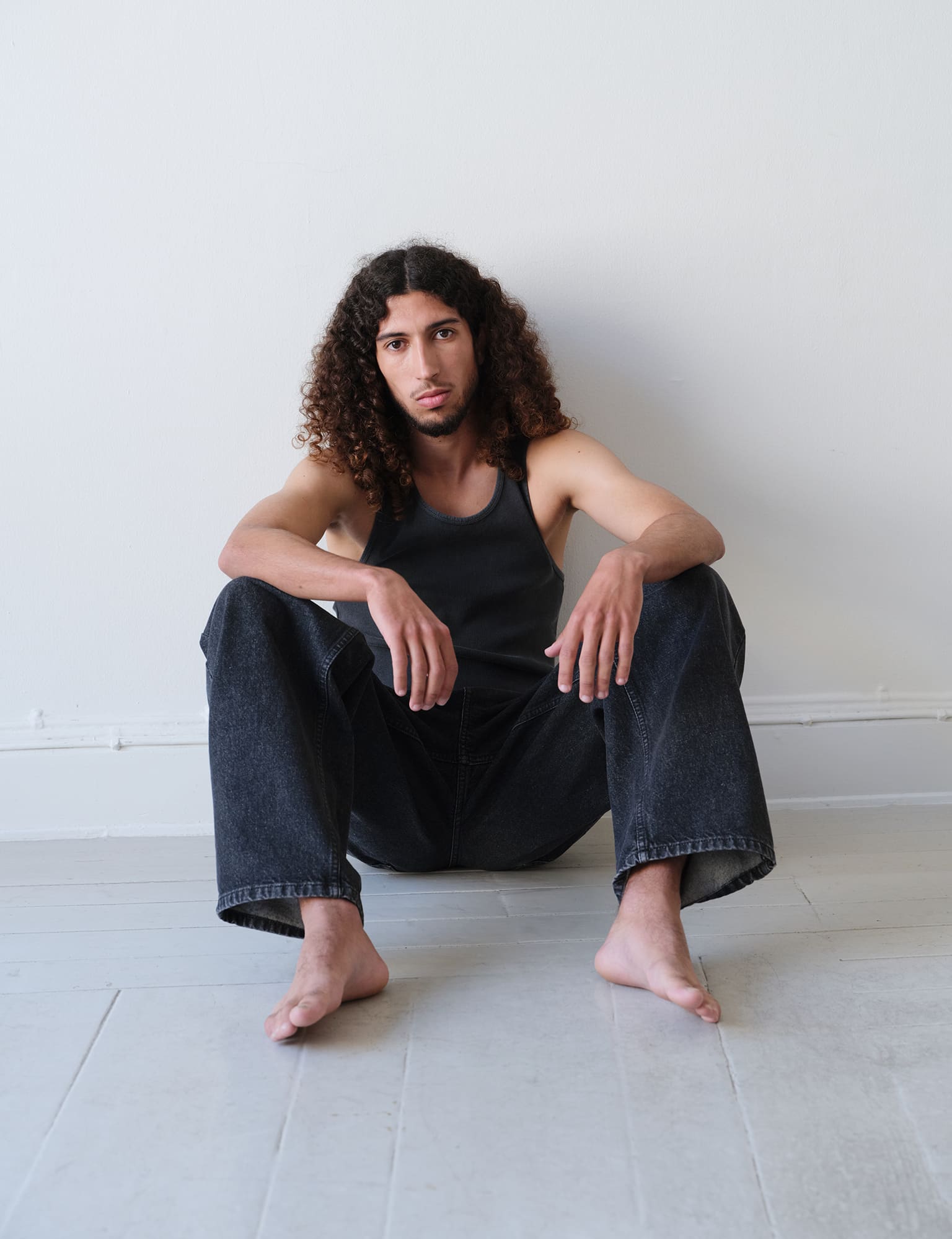 Modellen er 187 cm. høj og iført en størrelse 50/Large og 32 ved jeans.