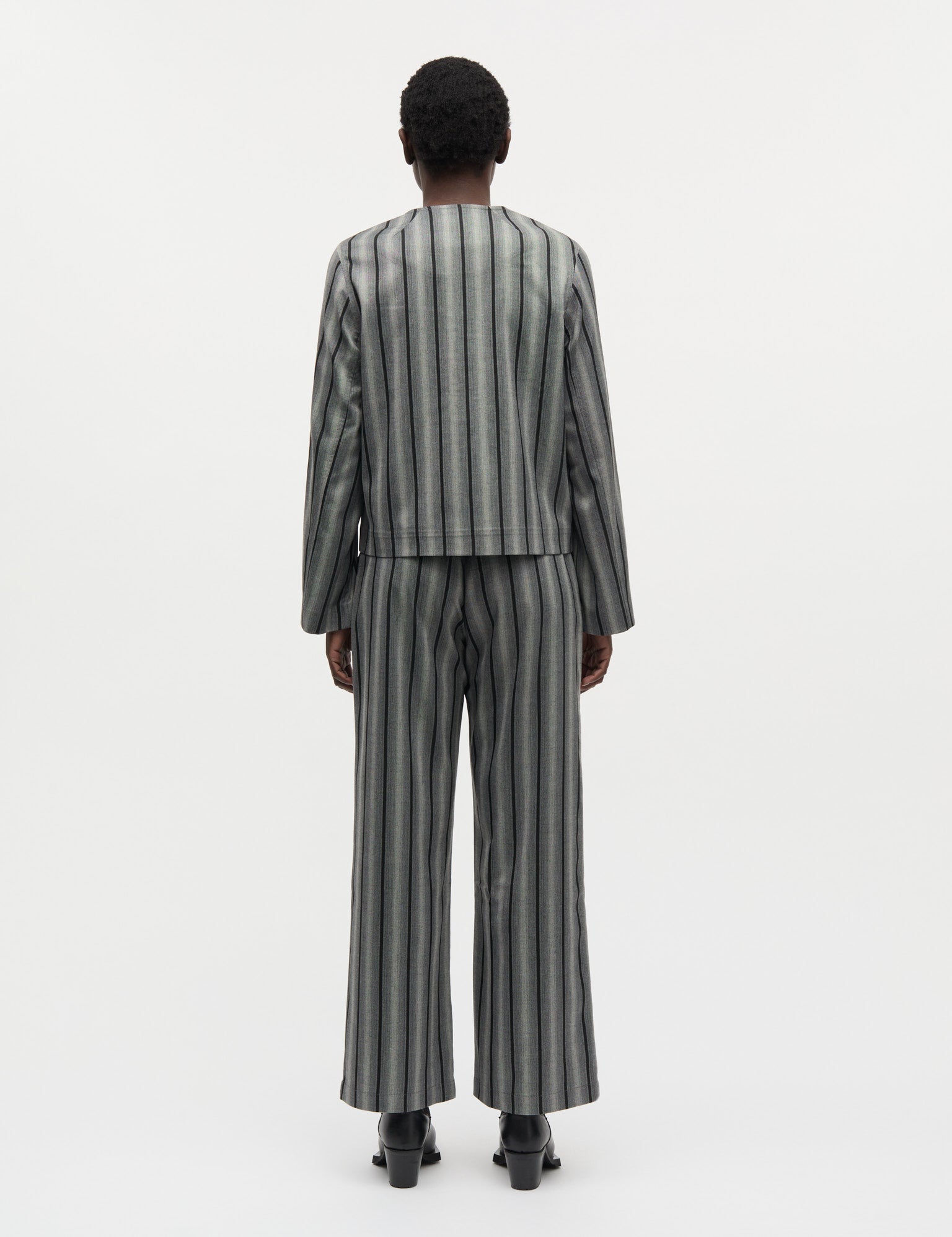 Boxy jakke med kort liv, lange ærmer, ingen revers, v-udskæring og lukkede udvendige lommer.