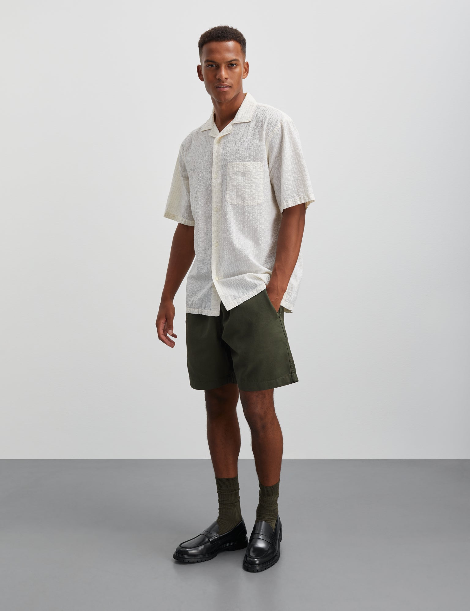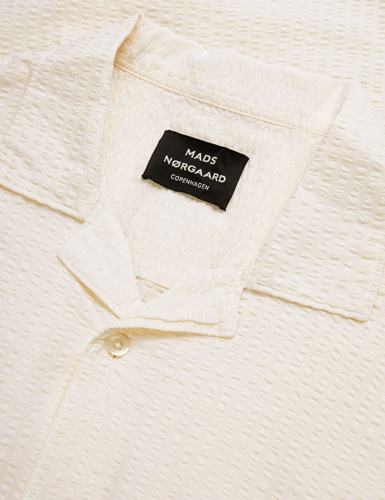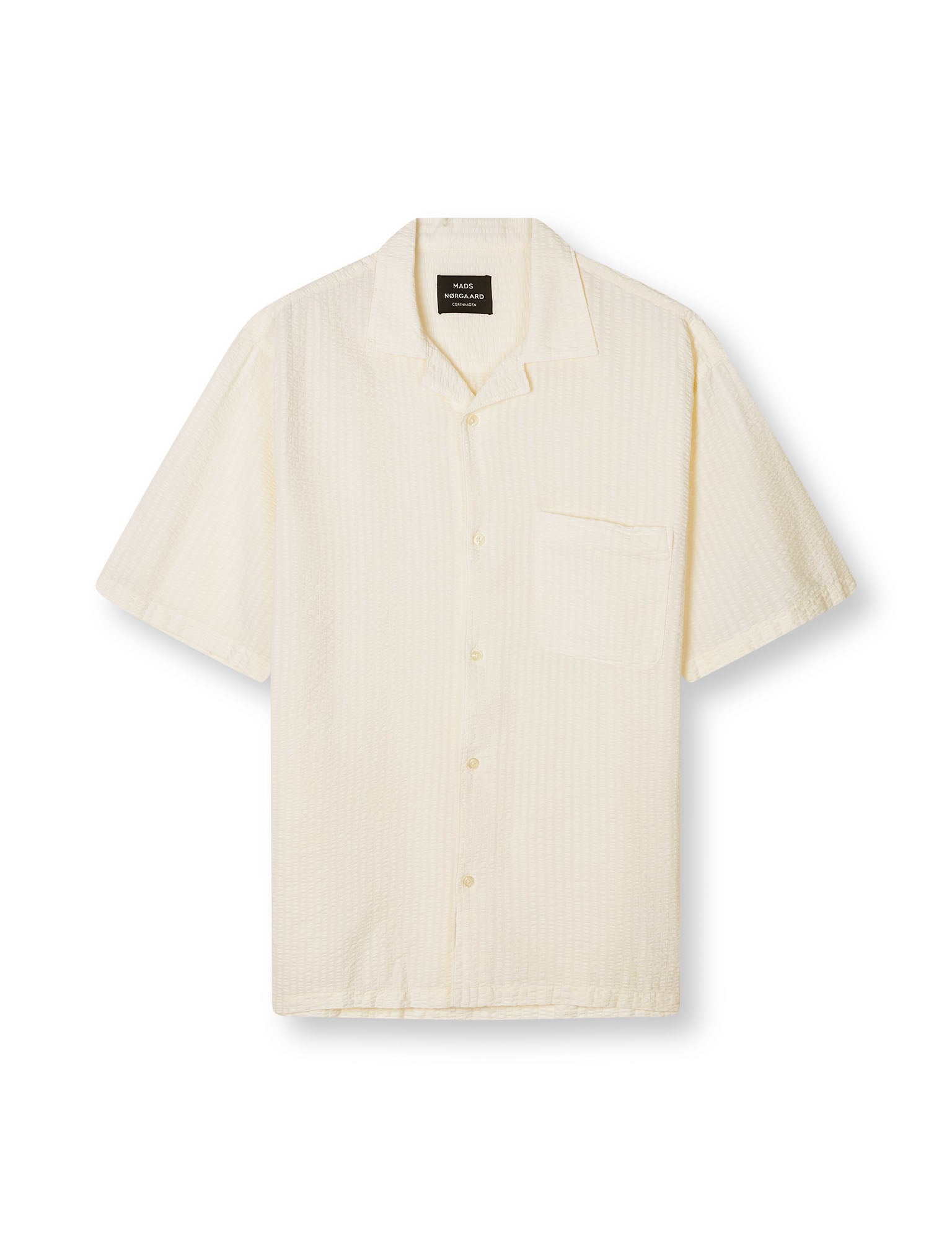 Vores Seersucker Kenji Shirt SS er lavet i en bomuld, som er vævet til let, blødt-sprødt bæk og bølge-stof. Pasformen er boxy med korte ærmer og en enkel lomme på det ene bryst.