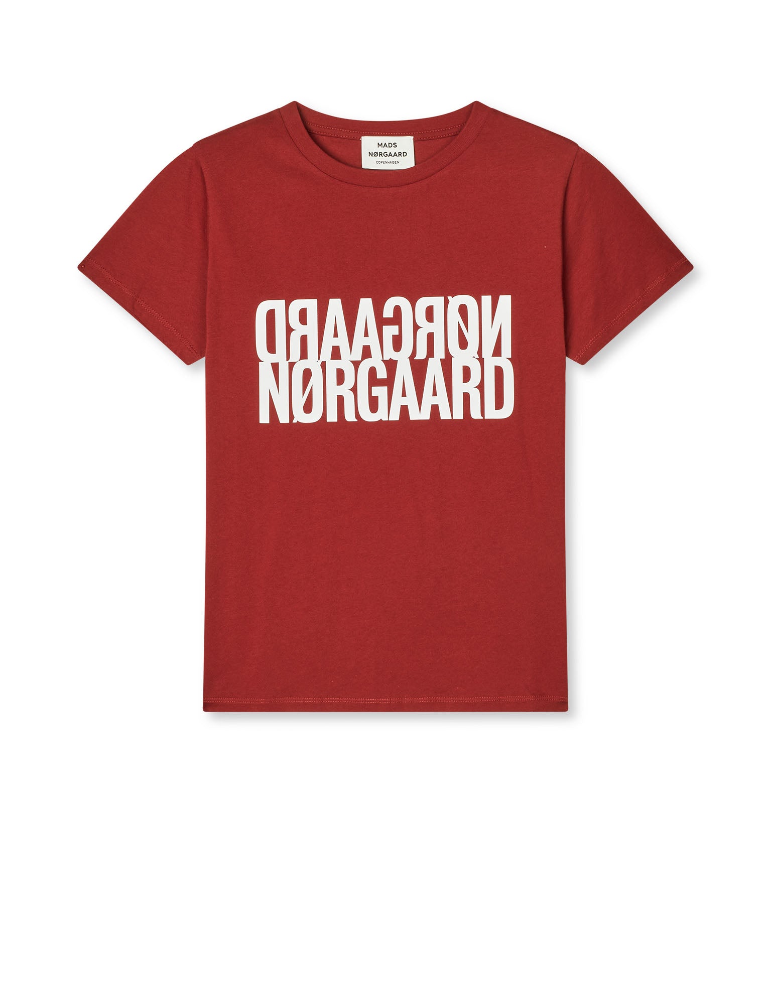 Let T-shirt med korte ærmer, rund hals og stort, delvist spejlvendt logoprint på brystet.