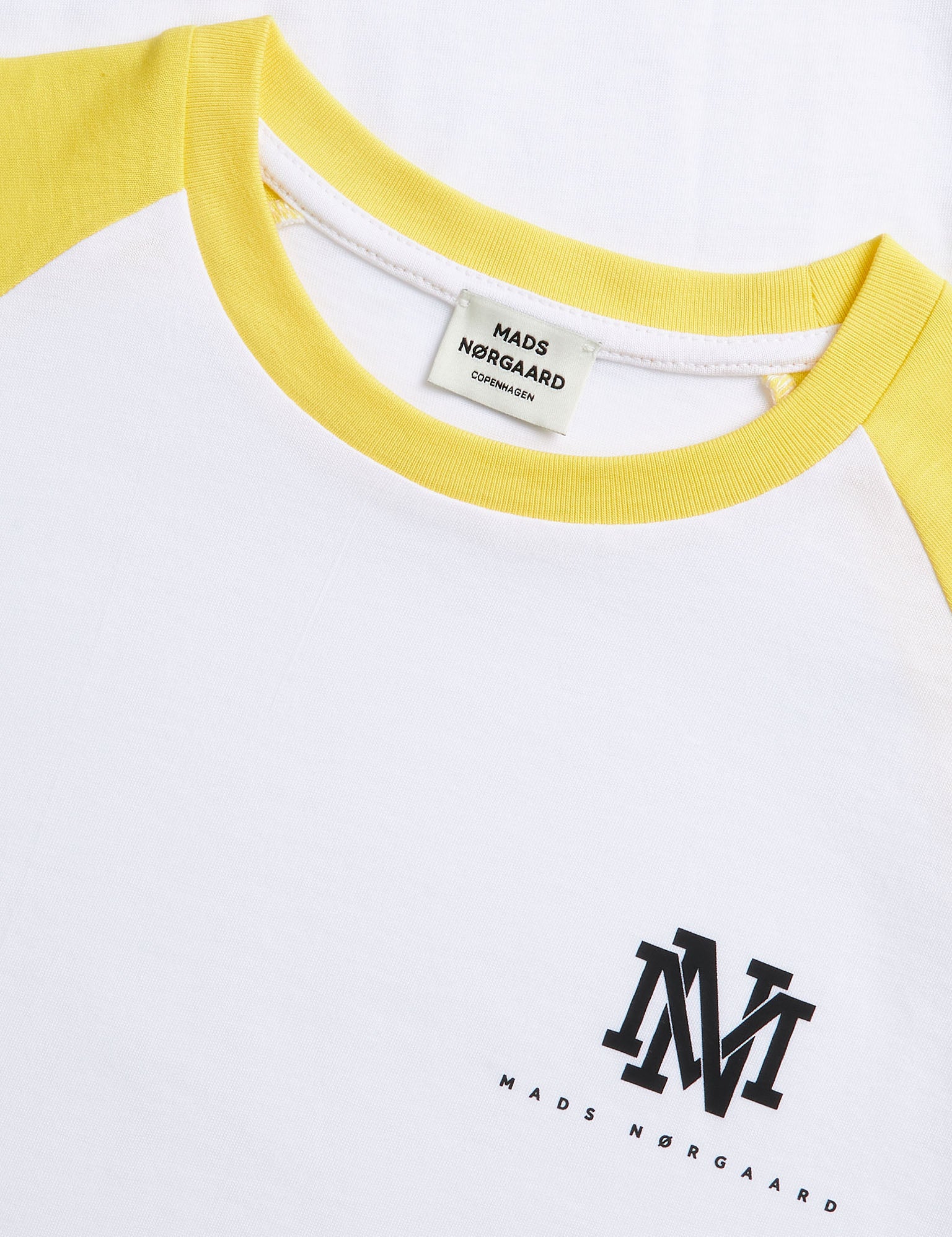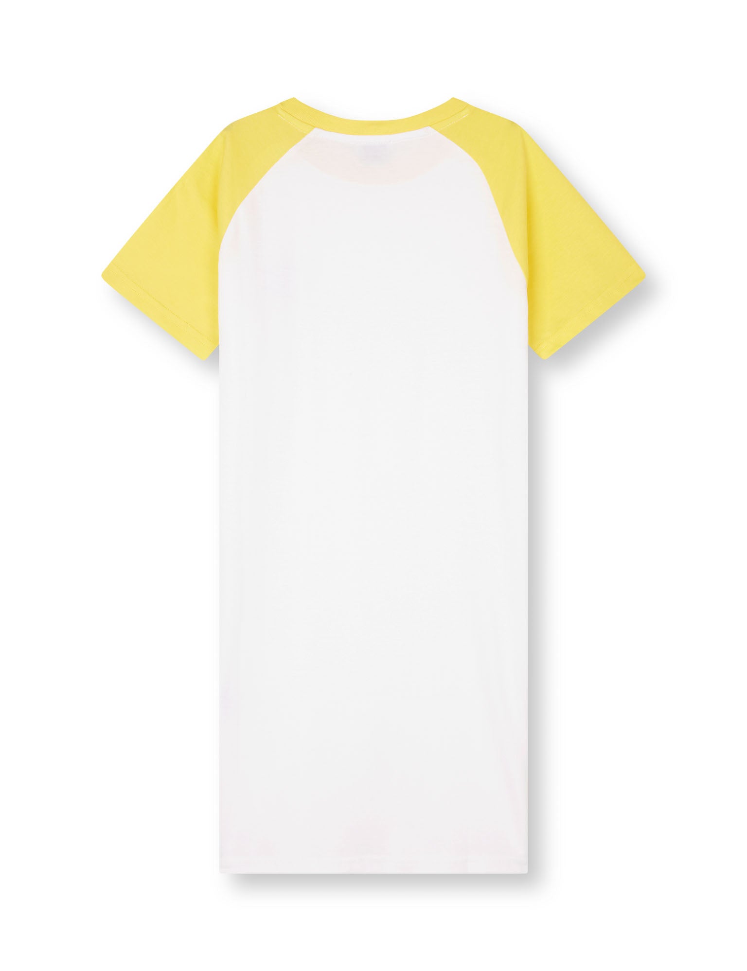 Vores Single Ditte Raglan Dress har en lige op og ned pasform. De korte, kontrastfarvede ærmer er raglan-ærmer, den runde hals har tynd rib, det baseball-inspirerede MN-logo sidder på brystet i venstre side, og ved nederste kant sidder en label med sort/hvide striber.