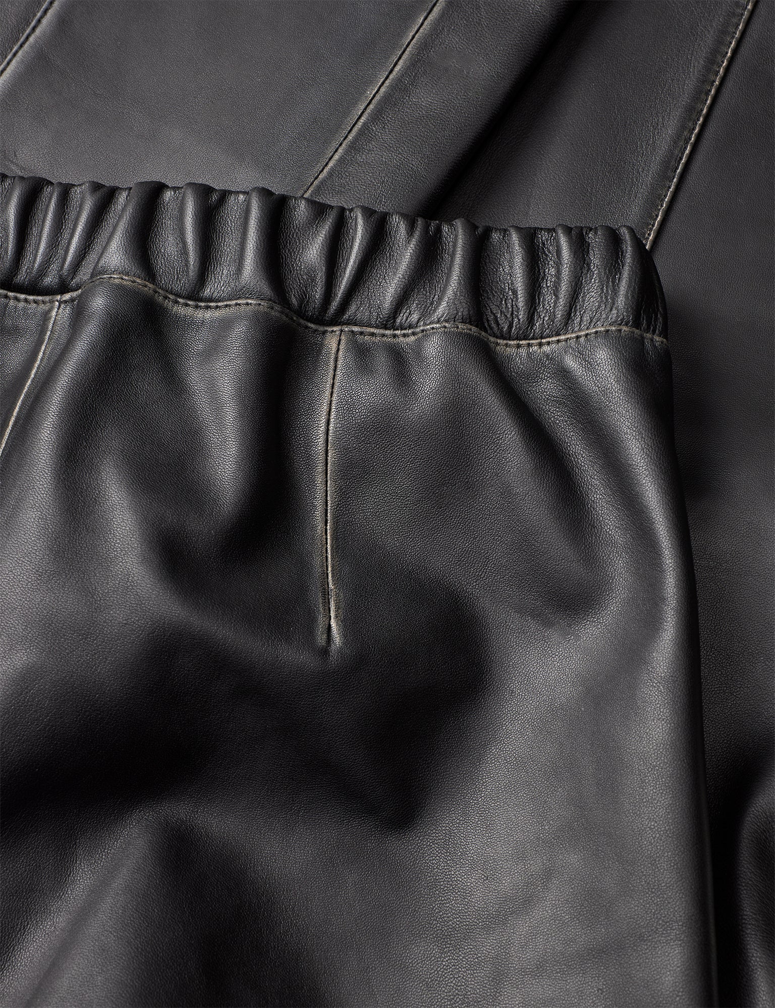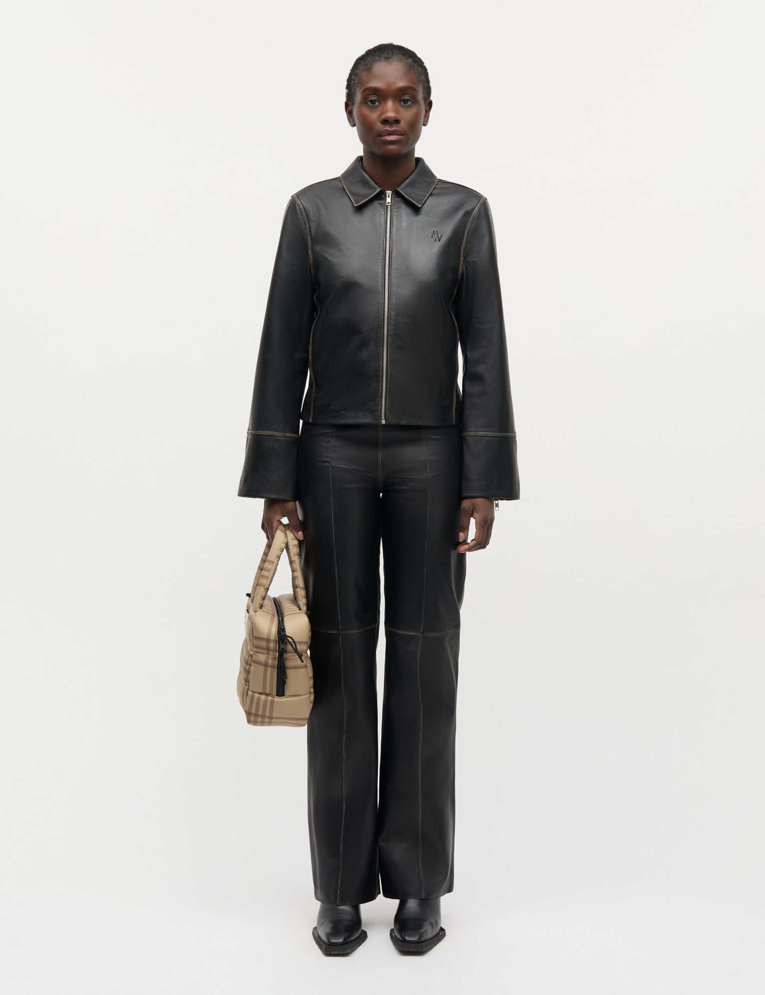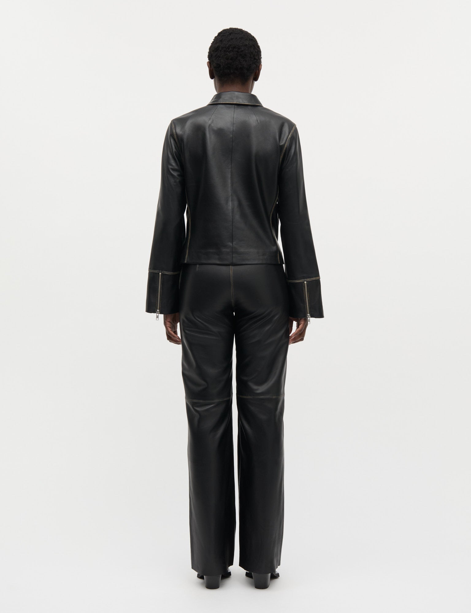 Tætsiddende læderbukser med boot cut-ben, synlige syninger og fast linning med elastik bagpå.