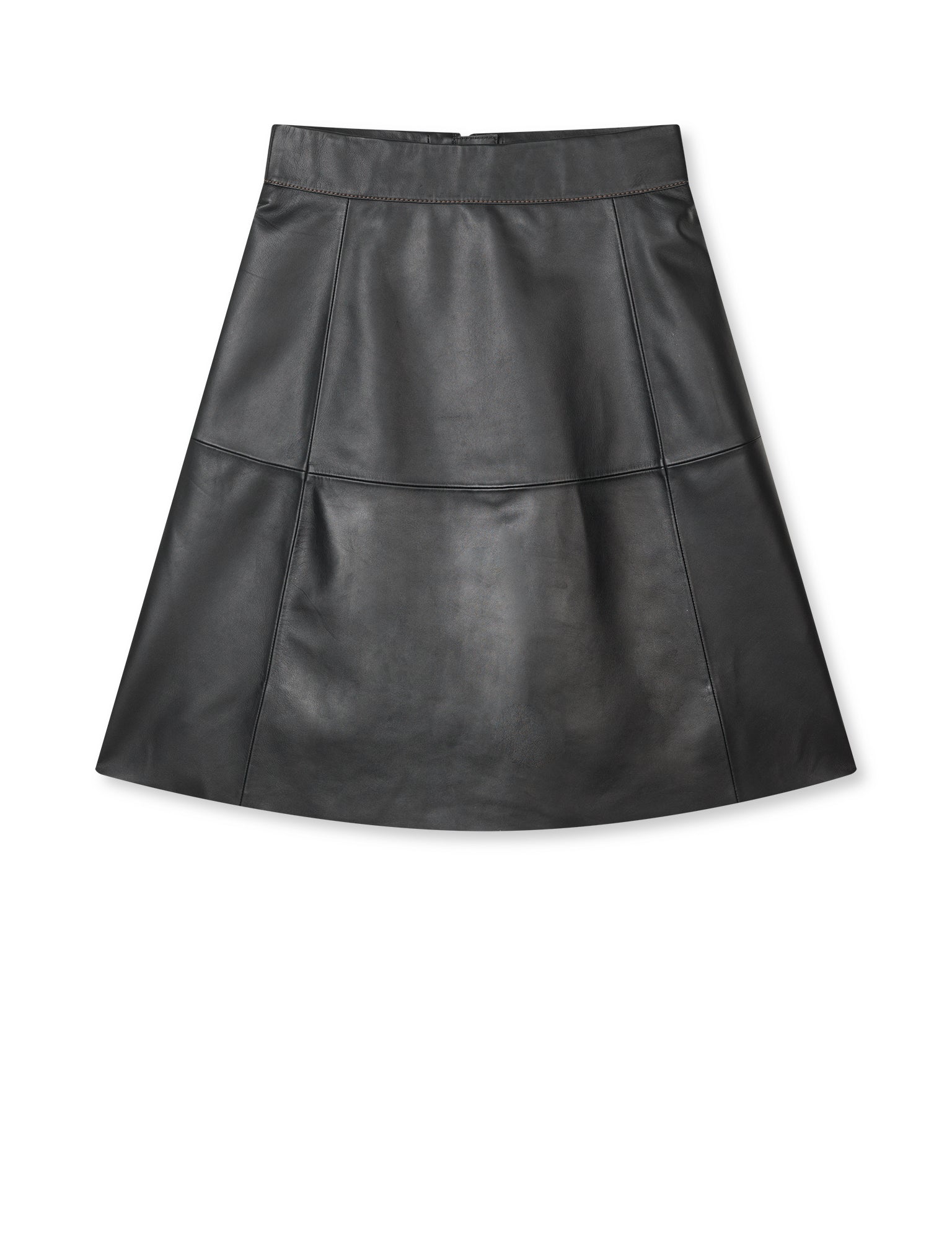 A-formet og knælang lædernederdel med synlige syninger, høj talje og fast linning med lynlås bagpå.