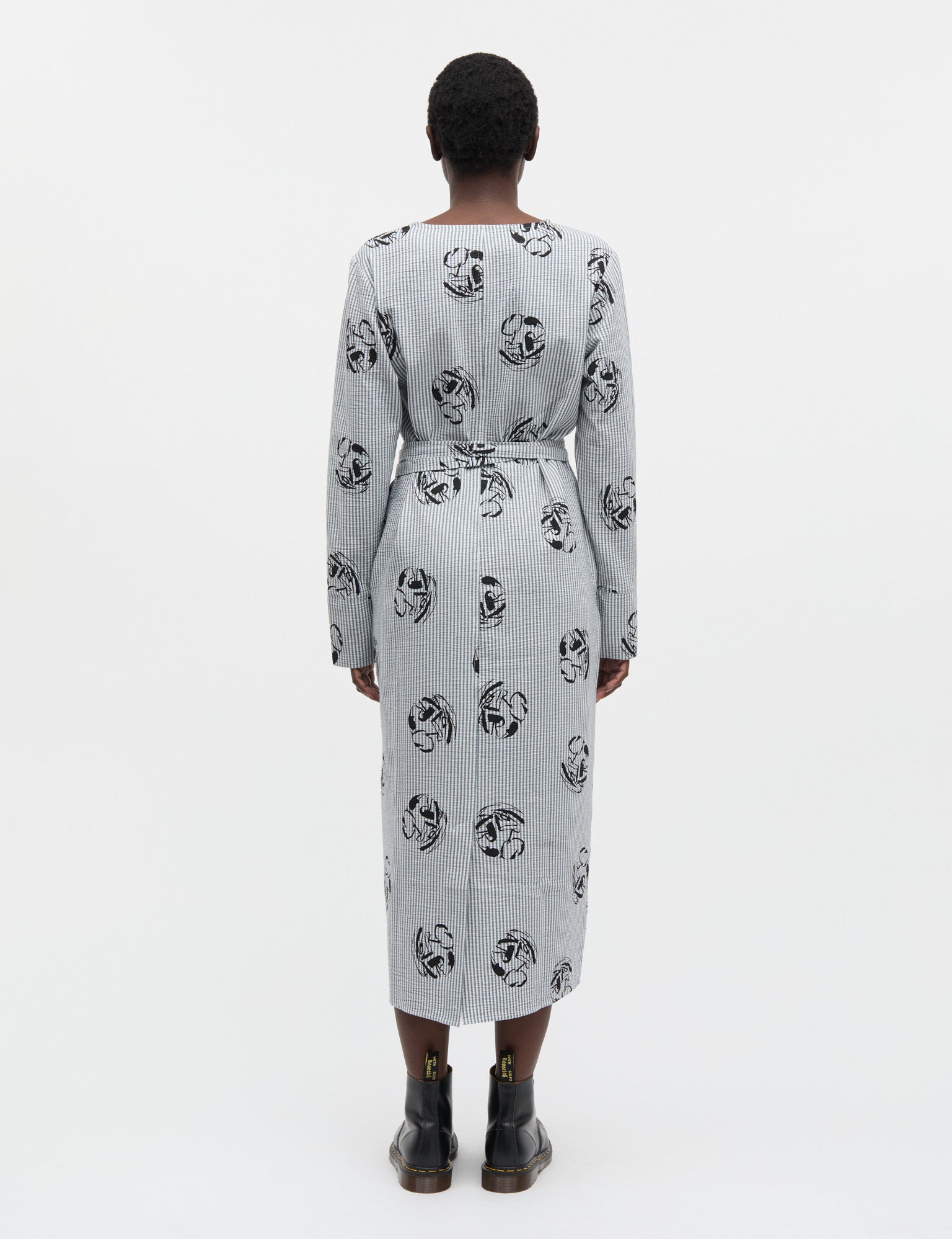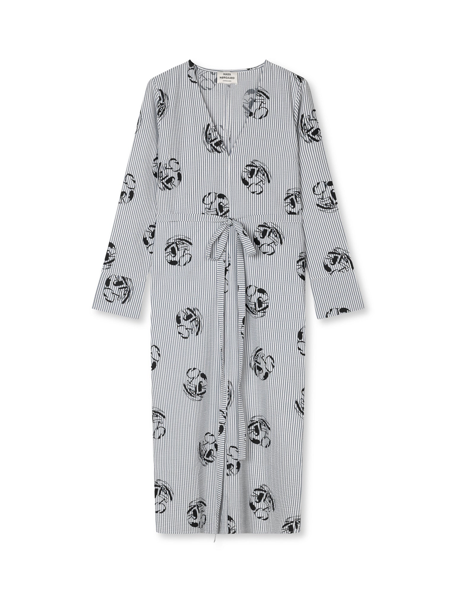 Løs, læglang og langærmet kjole med v-udskæring og bindebånd.