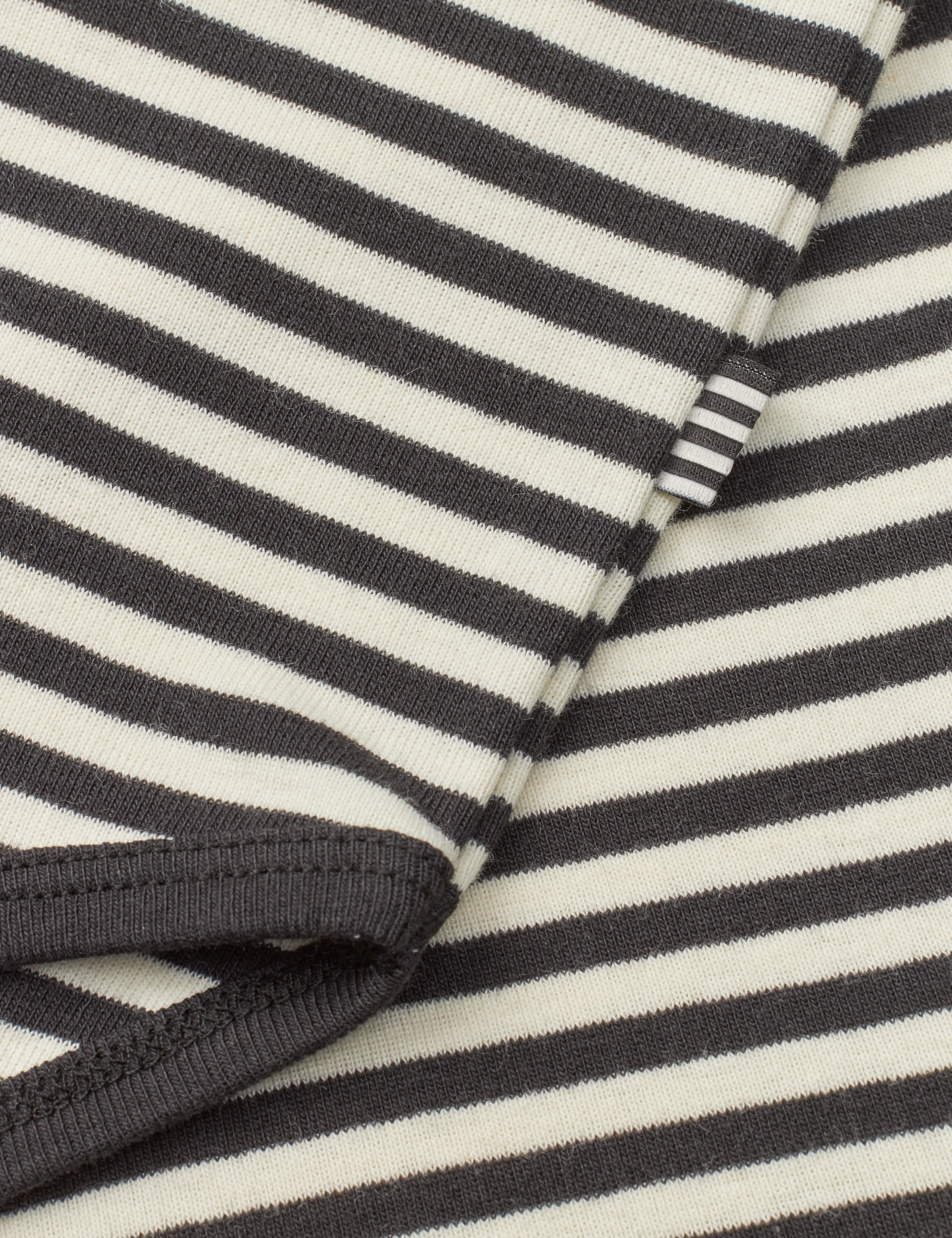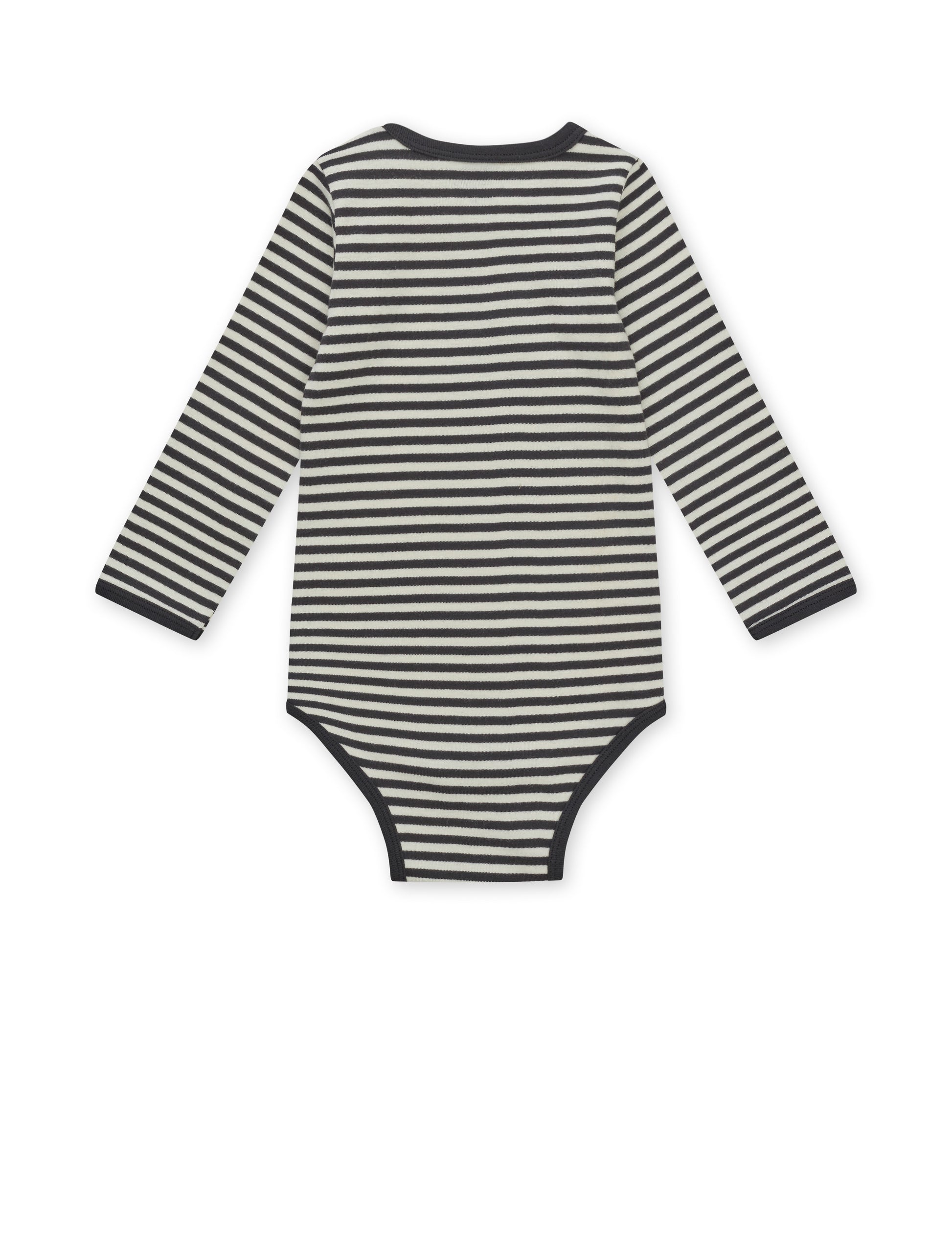 Stribet bodystocking er lavet en blød bomuld. I bunden sidder tre små trykknapper og i halsen sidder en enkelt.