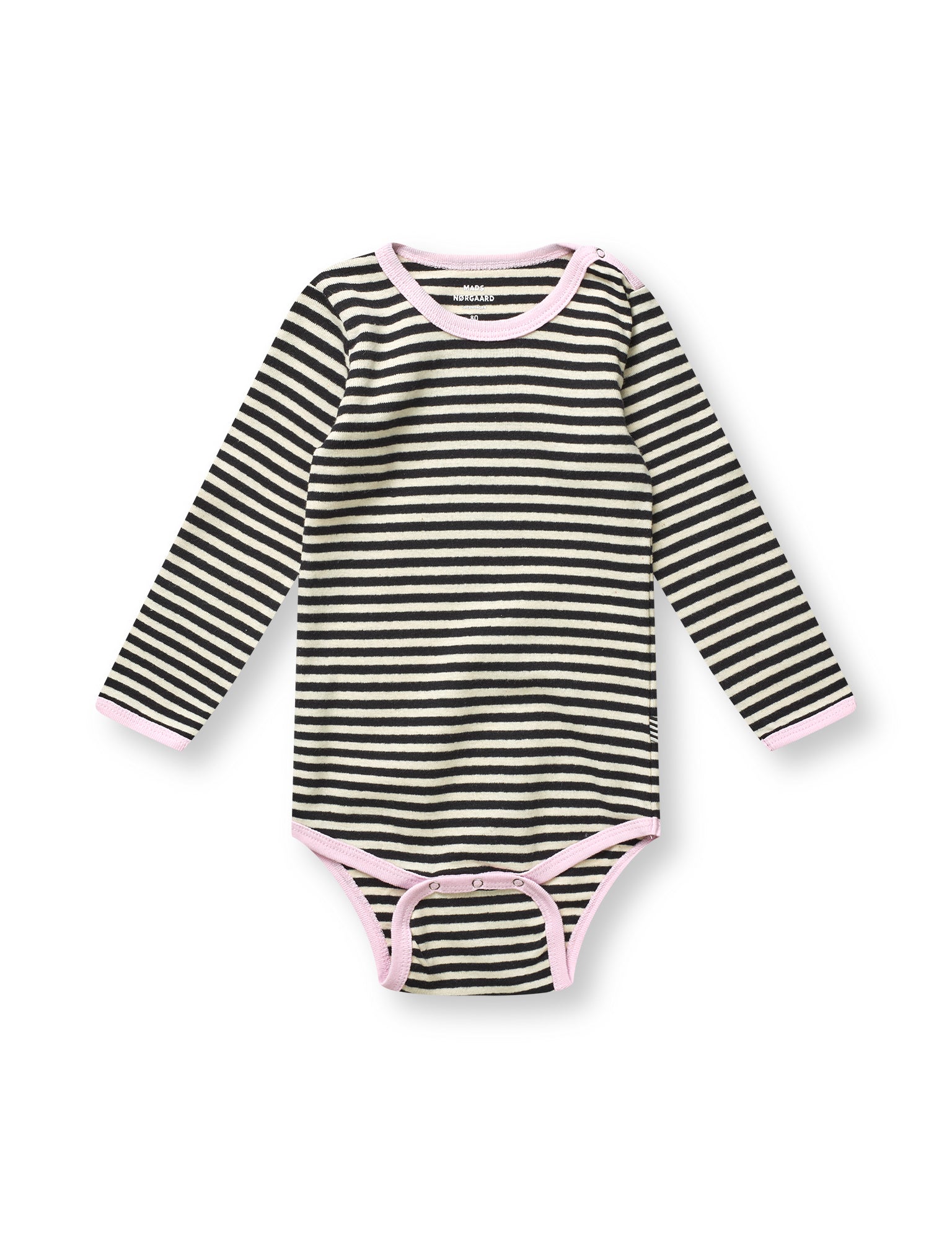 Soft Duo Striped Body er den bodystocking, du bruger hver dag og til alt, over og under, for sig selv eller sammen med andet. Den bløde bomuld er 100% økologisk og ribstrikket, så den kan strække sig og bevæge sig og være konstant komfortabel, og i bunden sidder tre små trykknapper og i halsen sidder en enkelt.