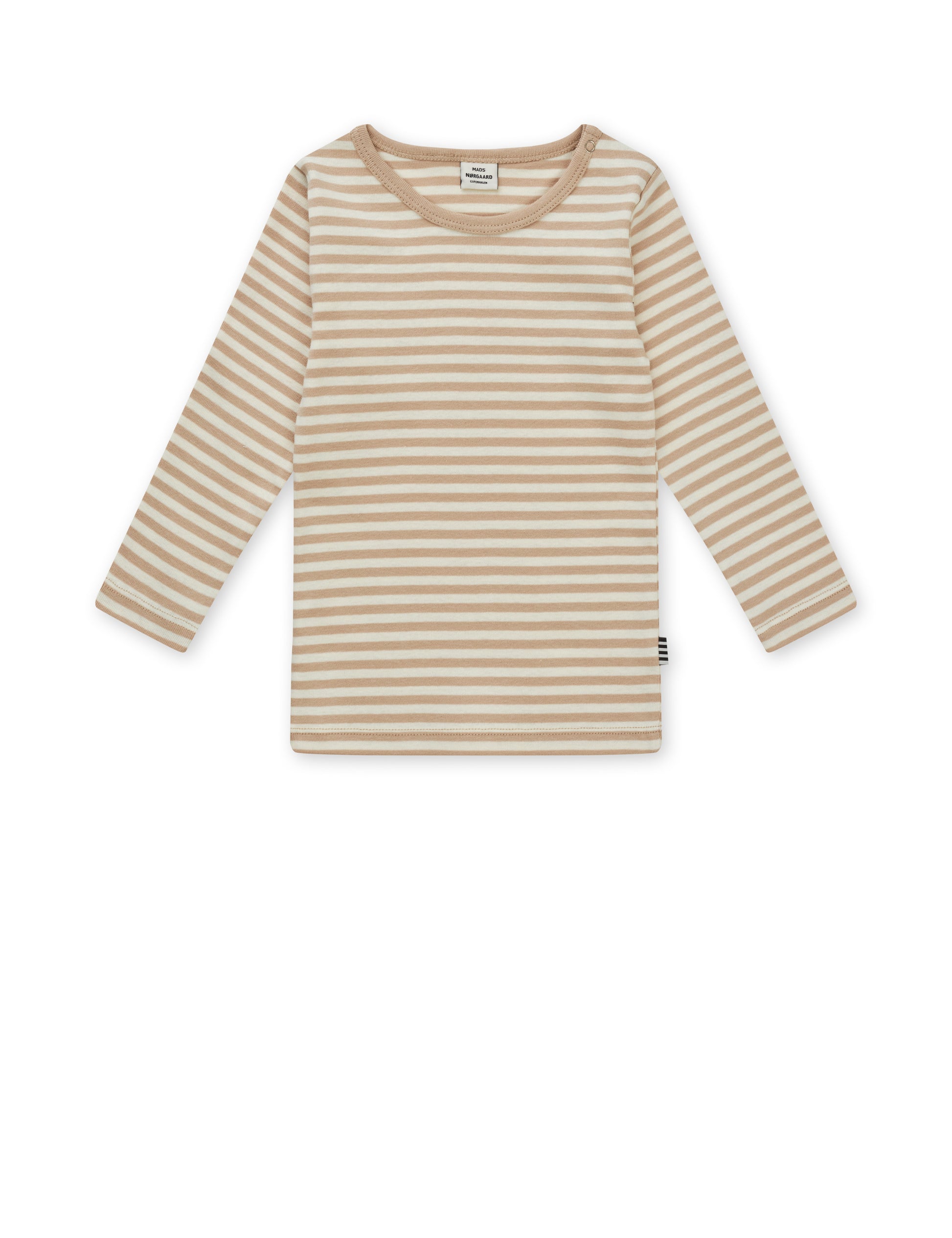 Stribet langærmet t-shirt som er lavet i en blød bomuld. Størrelse 56 til 92 har knapper ved halsen, størrelse 98 til 104 har ikke.