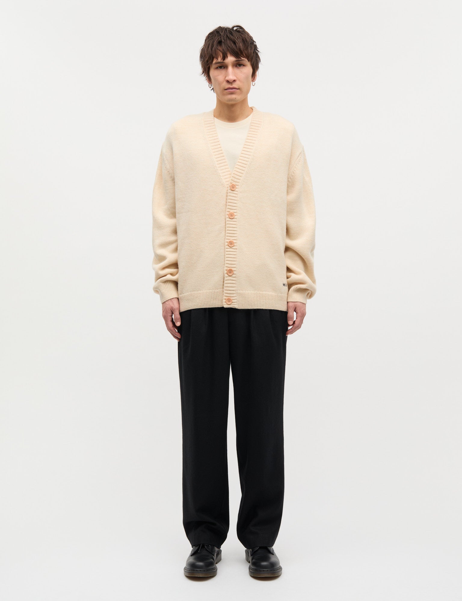 Blød og loose strikcardigan med hængende skuldre, V-udskæring, knapper og ribstrikkede kanter.