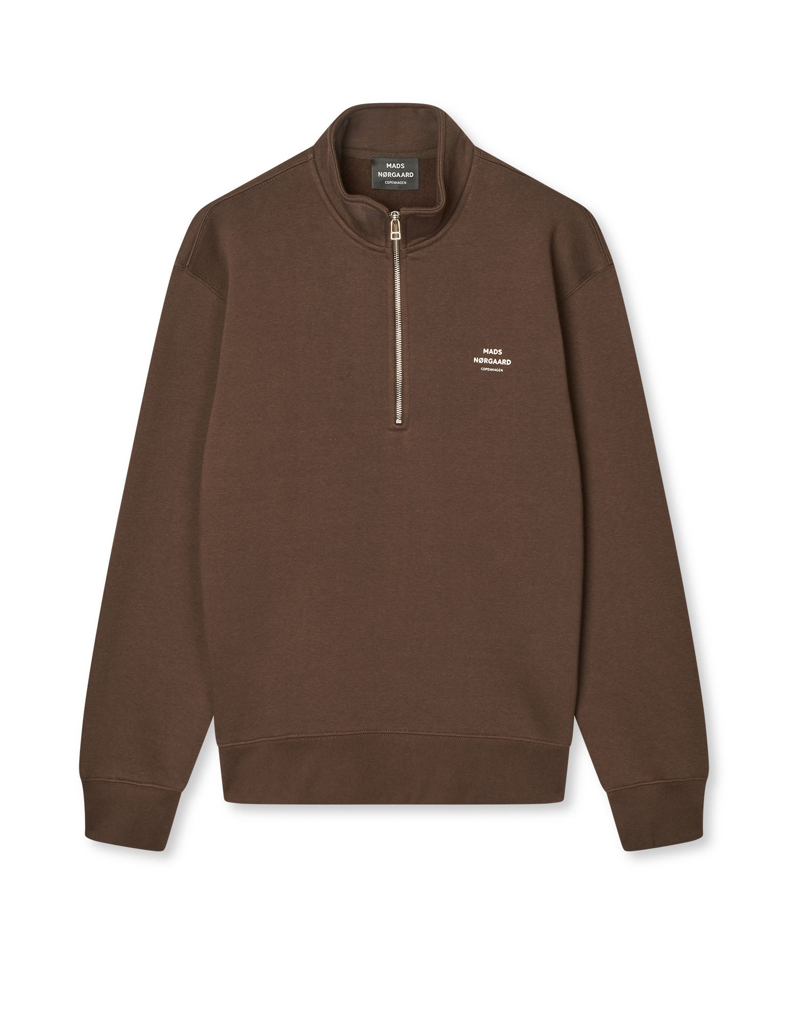 Blød sweatshirt med høj hals med lynlås til midt på brystet, ribkanter og lille logo på brystet.