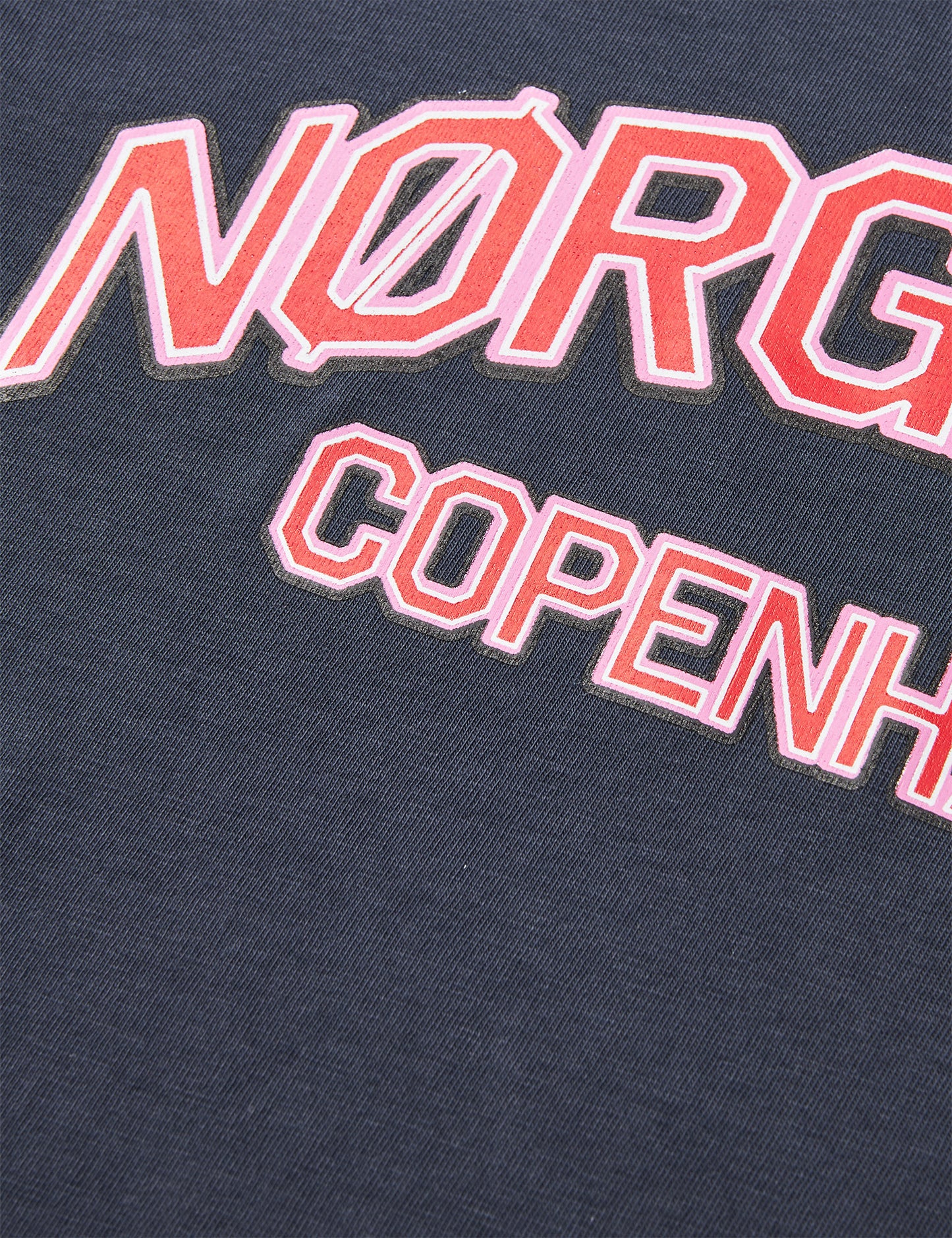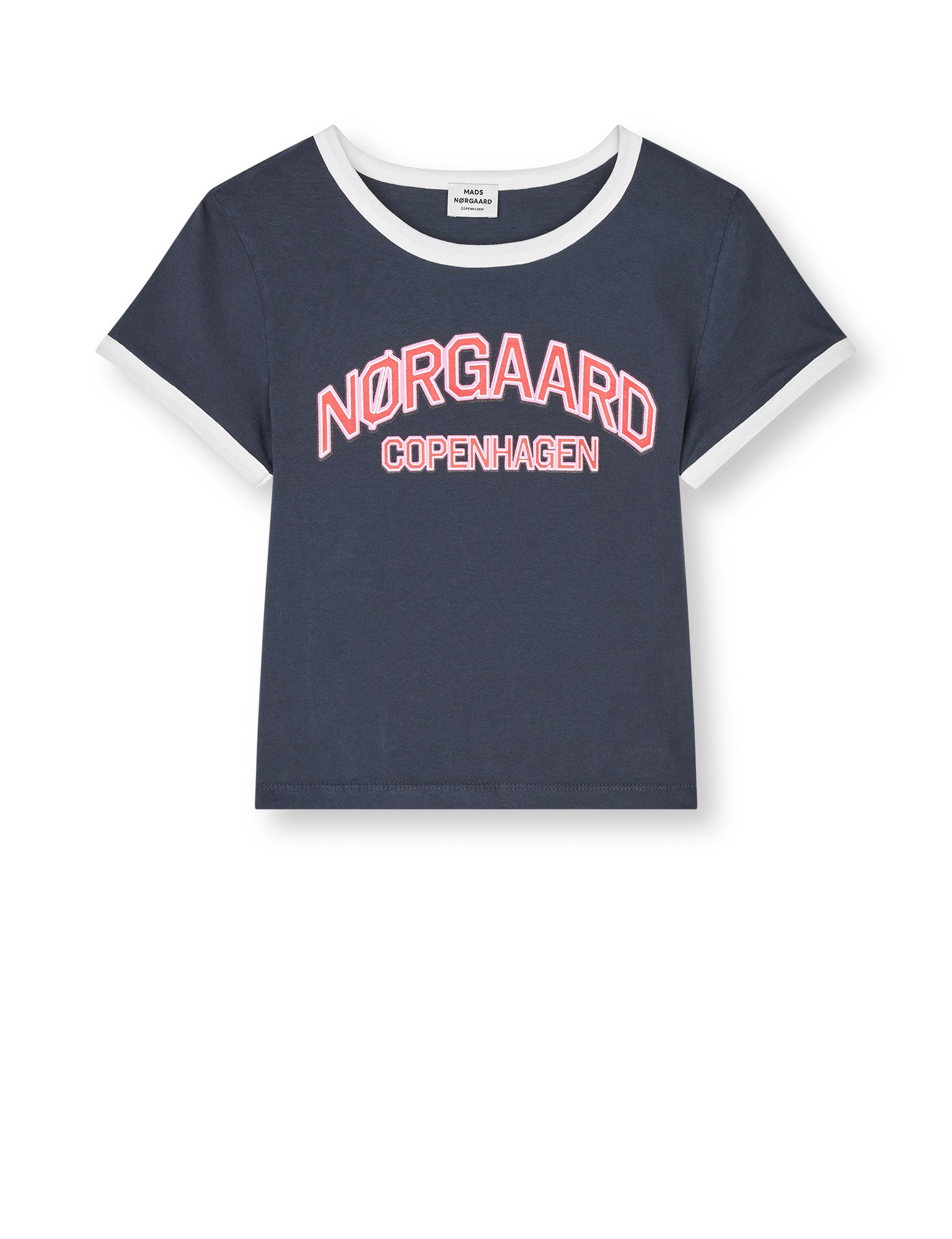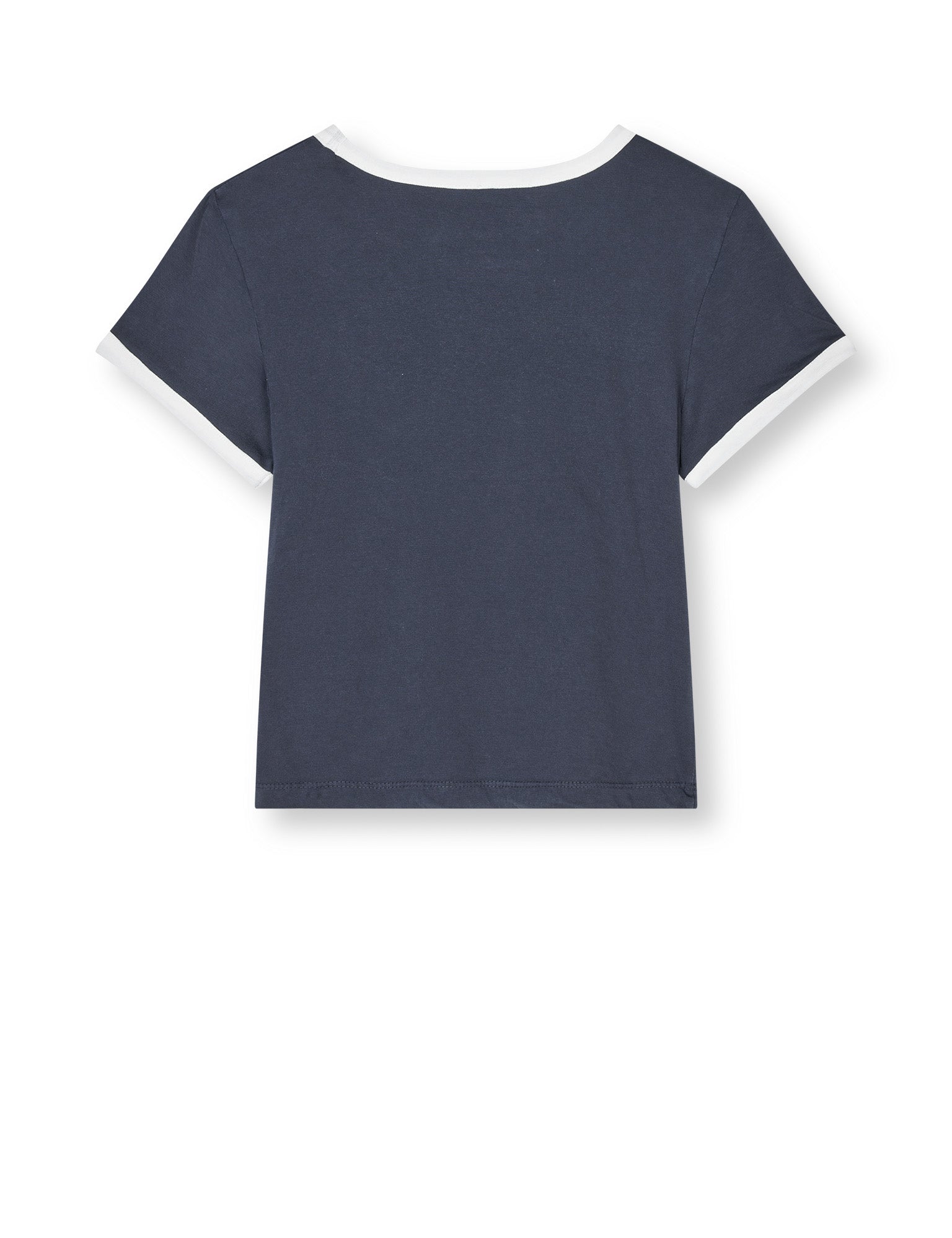 Blød, boxy og en anelse cropped T-shirt med print på brystet og kontrastkanter.