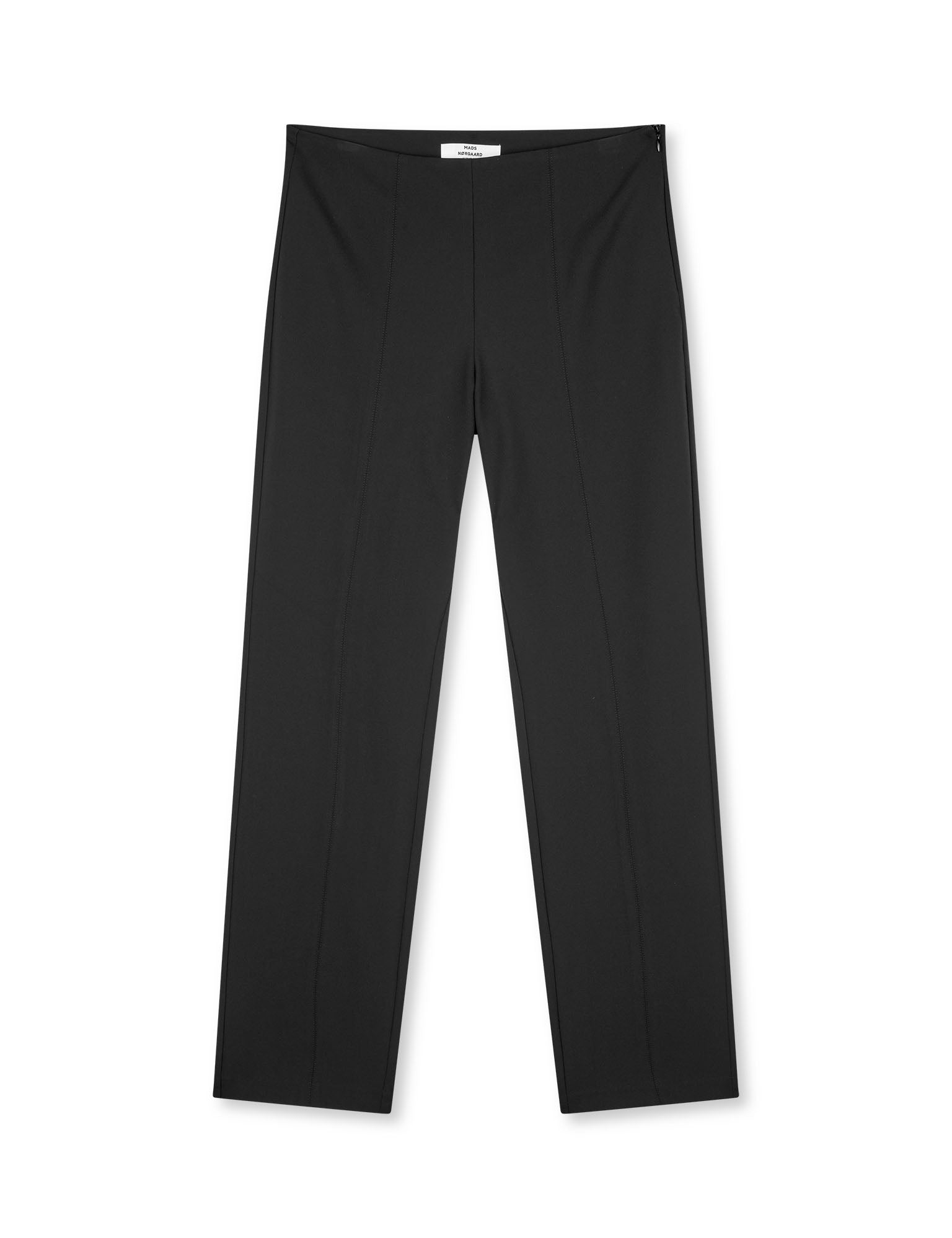 Tætsiddende bukser med lige ben, høj talje og pressefolder foran. Skjult sidelukning og let elastisk pasform.