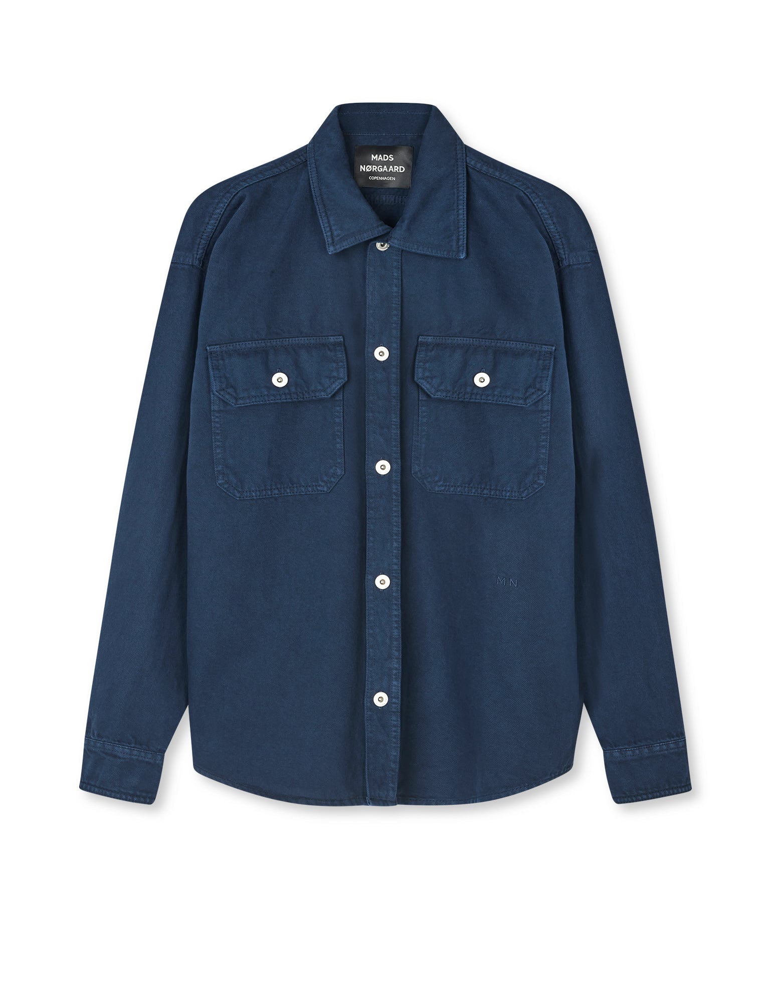 Sunset Twill August Work er boxy, afslappet og uformel. Skjorten kan også bruges som overskjorte, og den har denimknapper, cut-away krave og to tilknappede brystlommer.