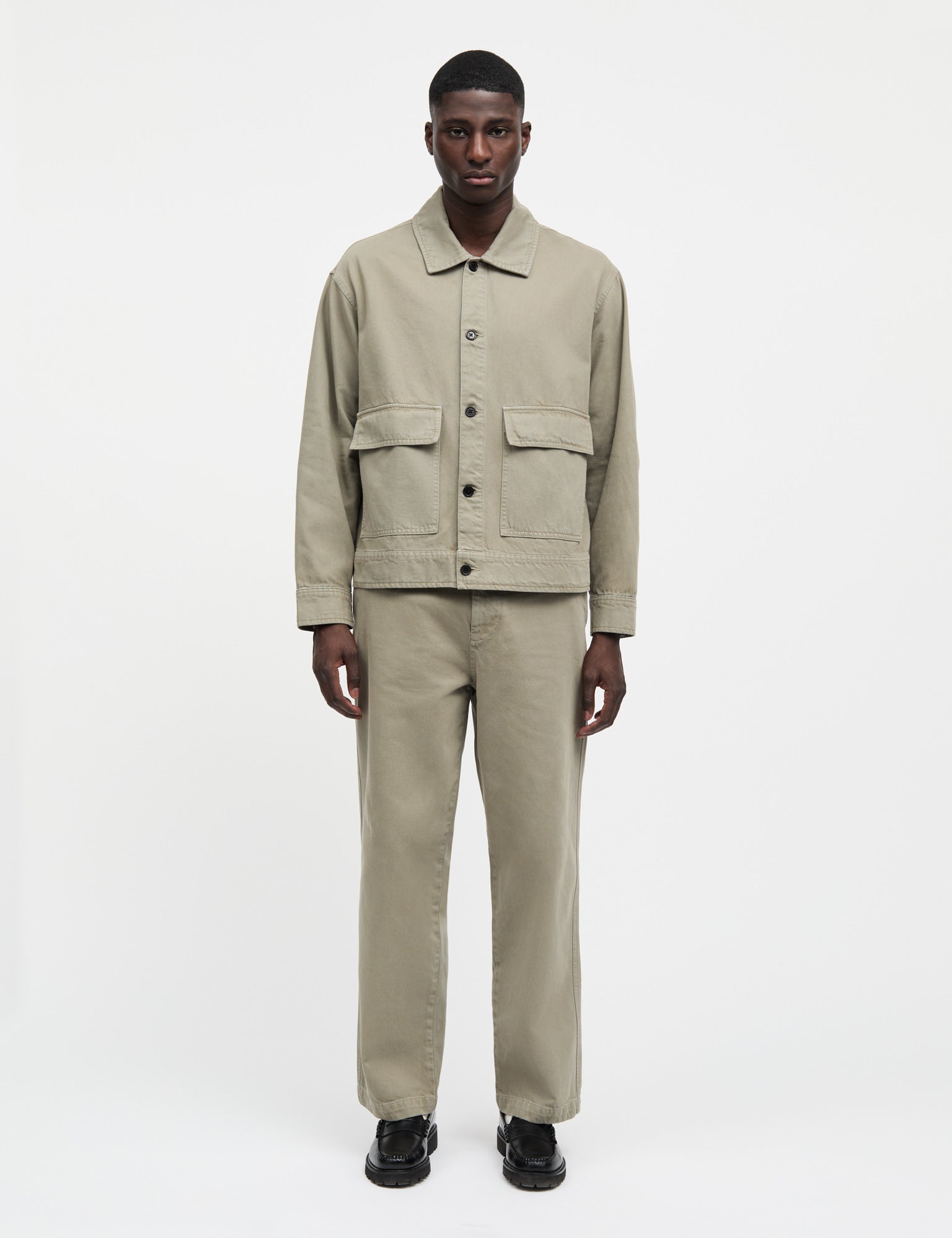 Boxy og løs jakke med cut-away krave, medium knapper, manchetter og to udvendige lommer.
