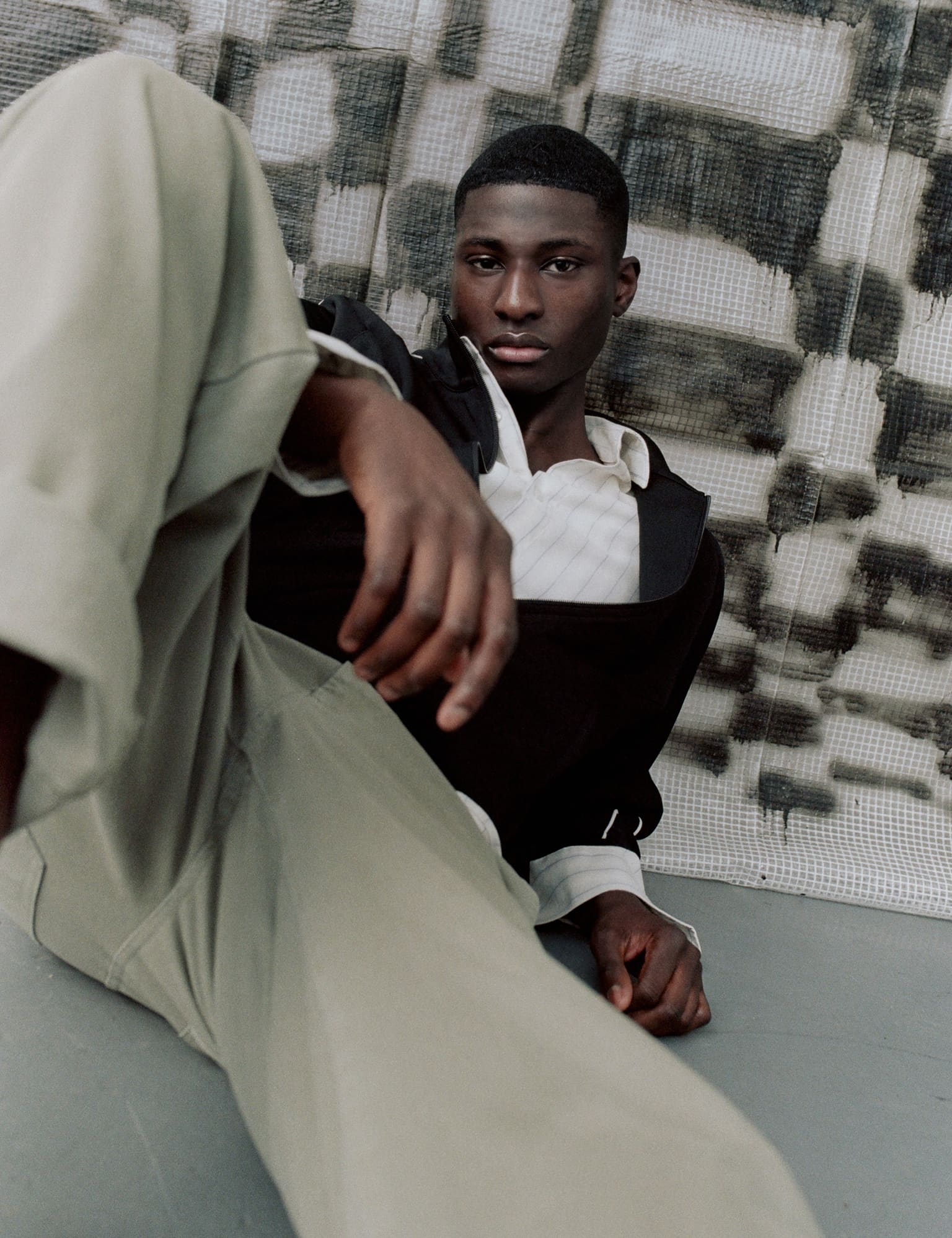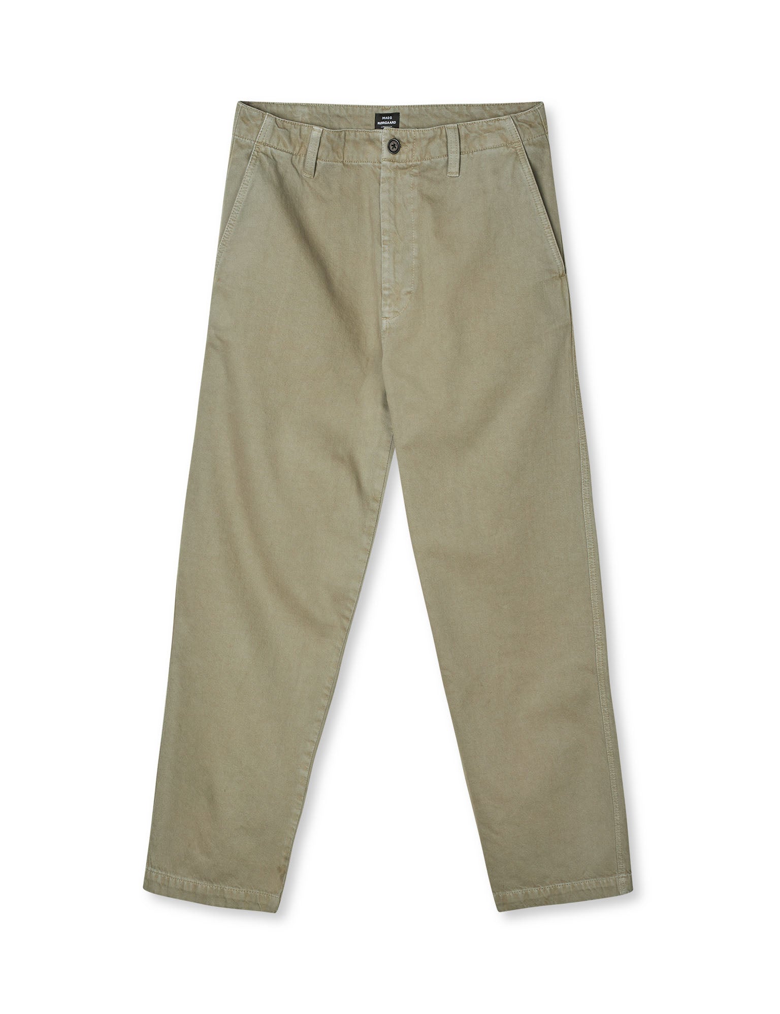 Løstsiddende chinos med lige ben, stiklommer, baglommer og fast linning med lynlås, knap og bæltestropper.