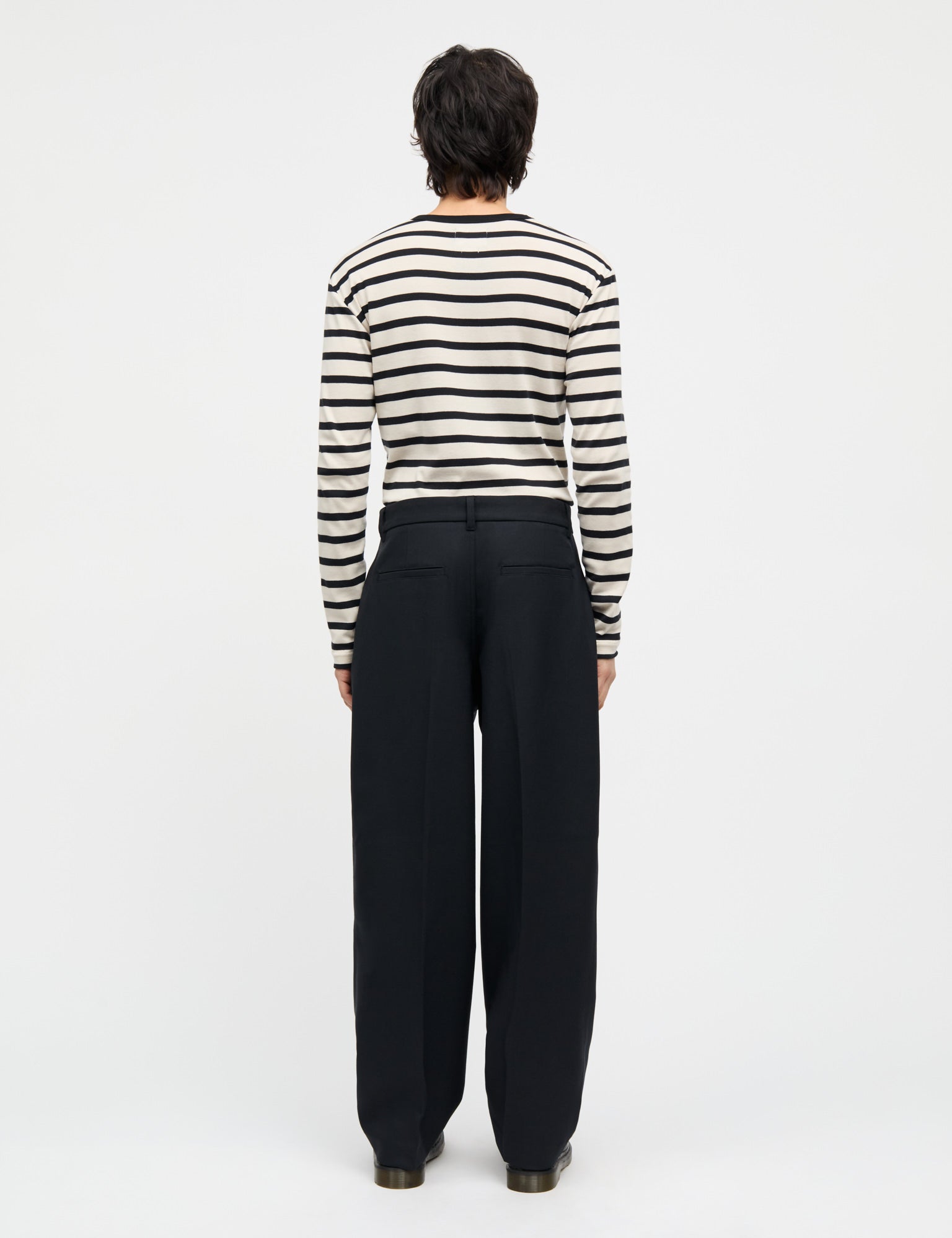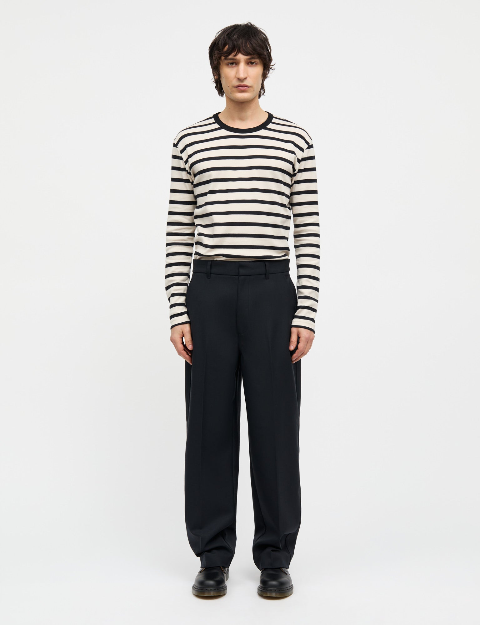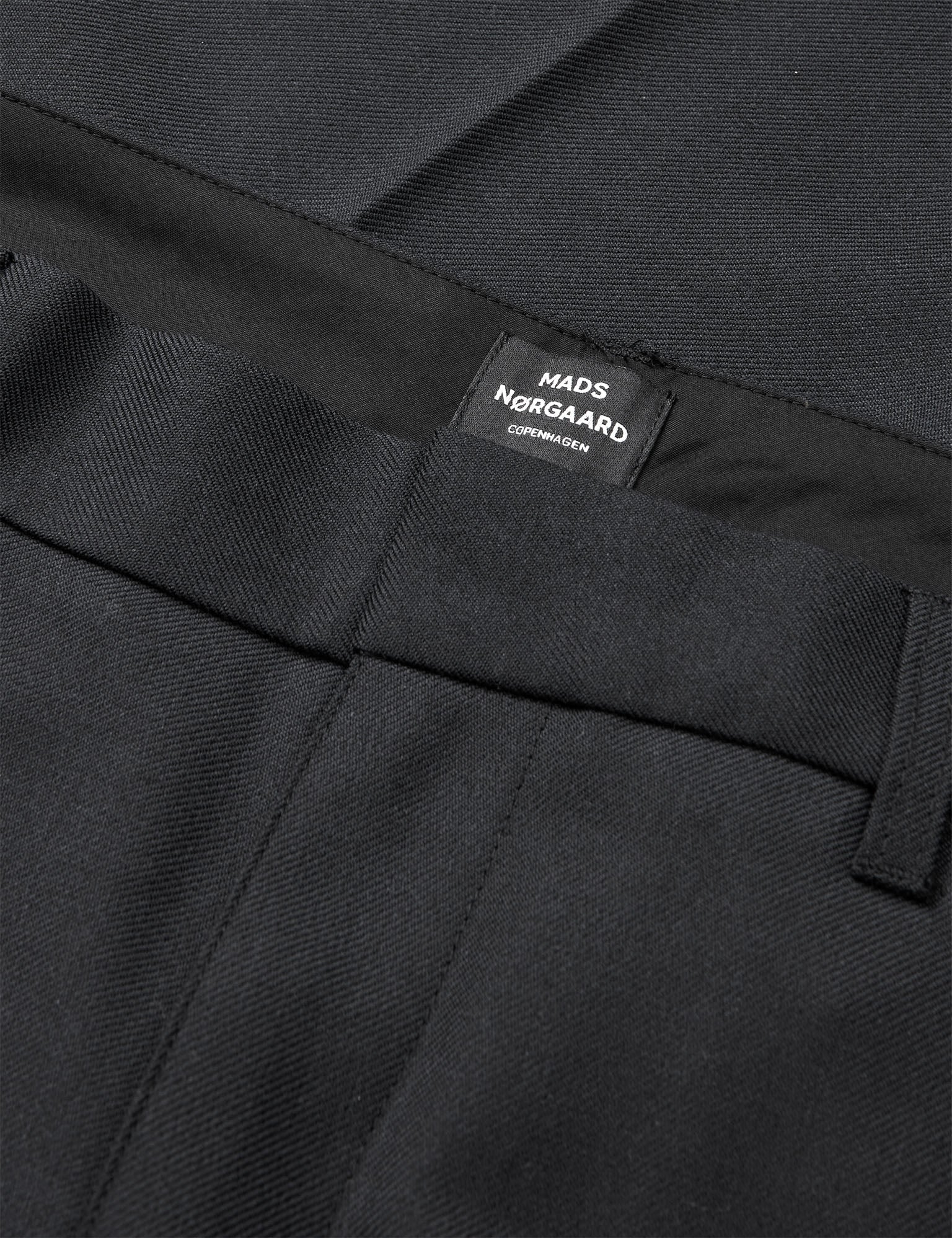 Glatte, løstsiddende bukser med pressefolder, lynlås og fast linning med bæltestropper.