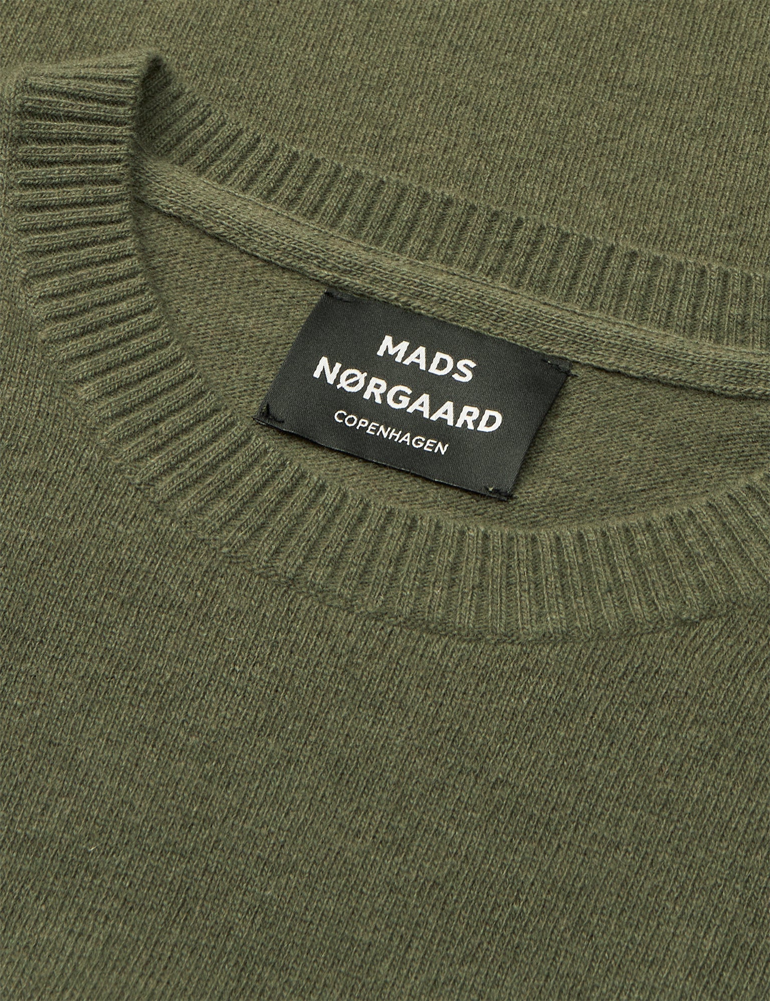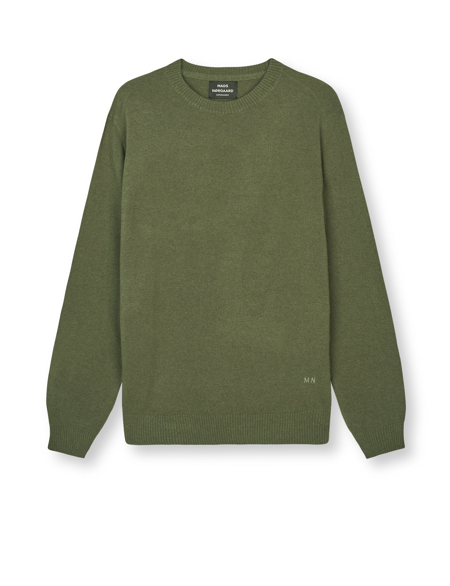 Blød striktrøje med strikkede ribkanter og lille initial-logo broderet ved hoften.