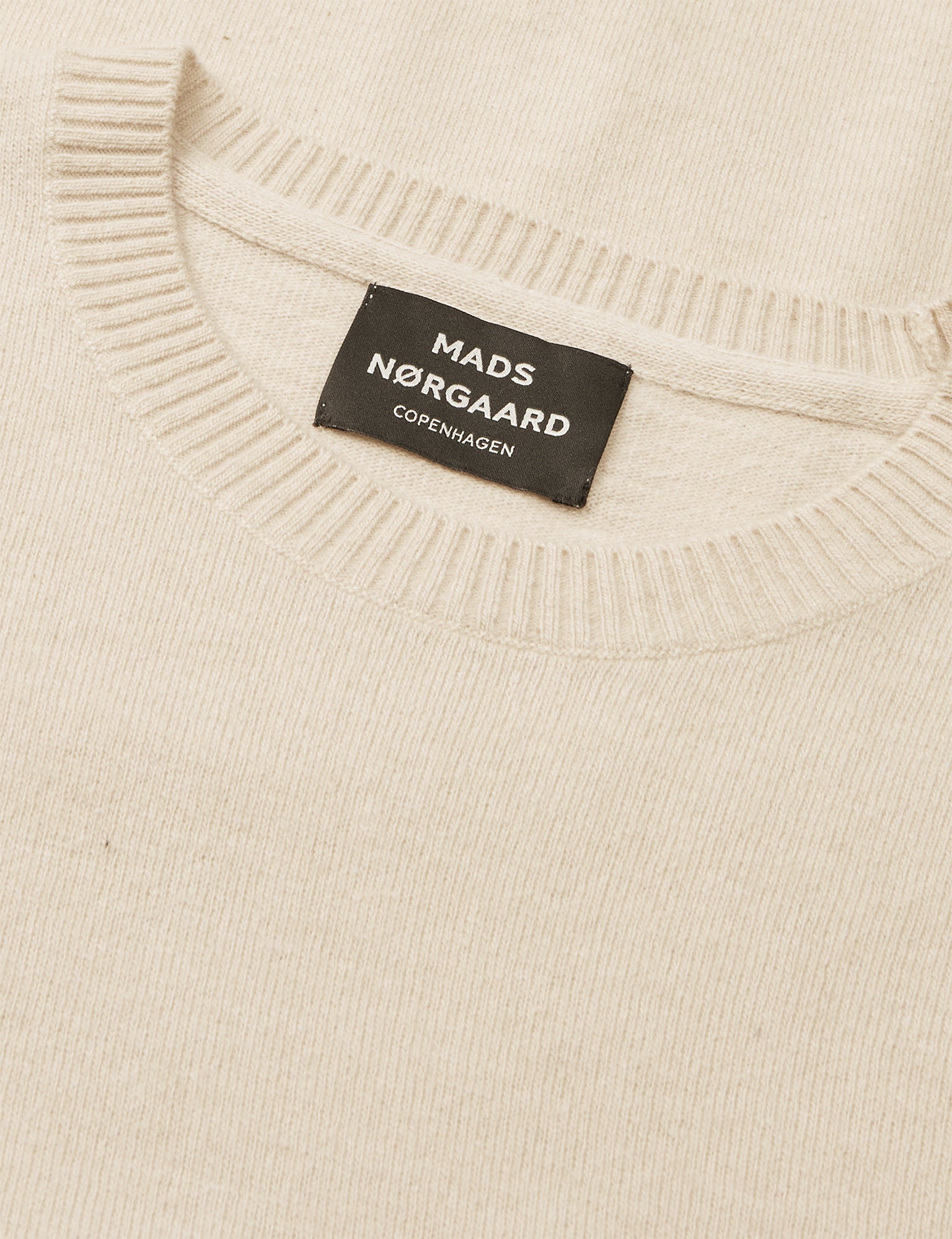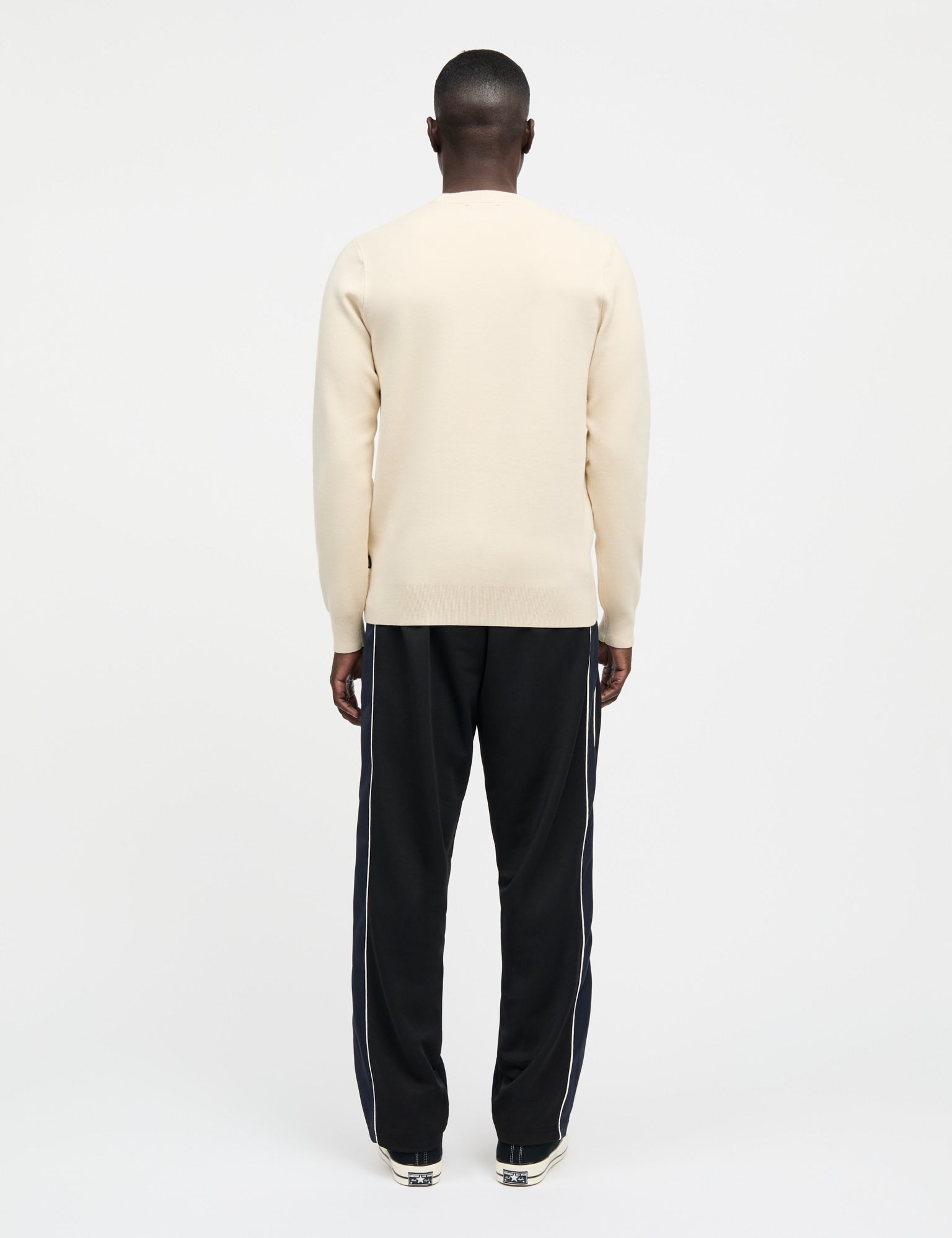 Blød striktrøje med strikkede ribkanter og lille initial-logo broderet ved hoften.