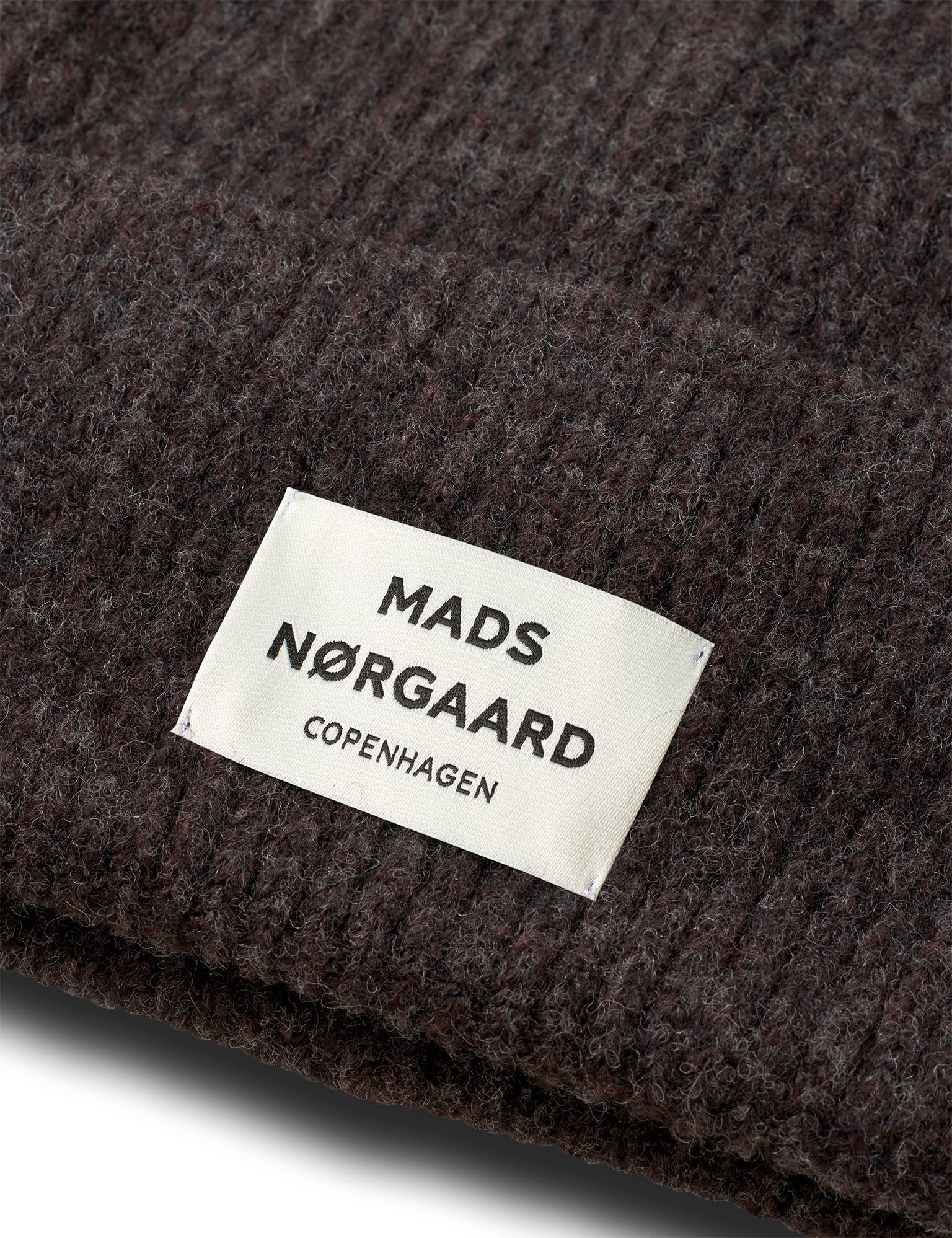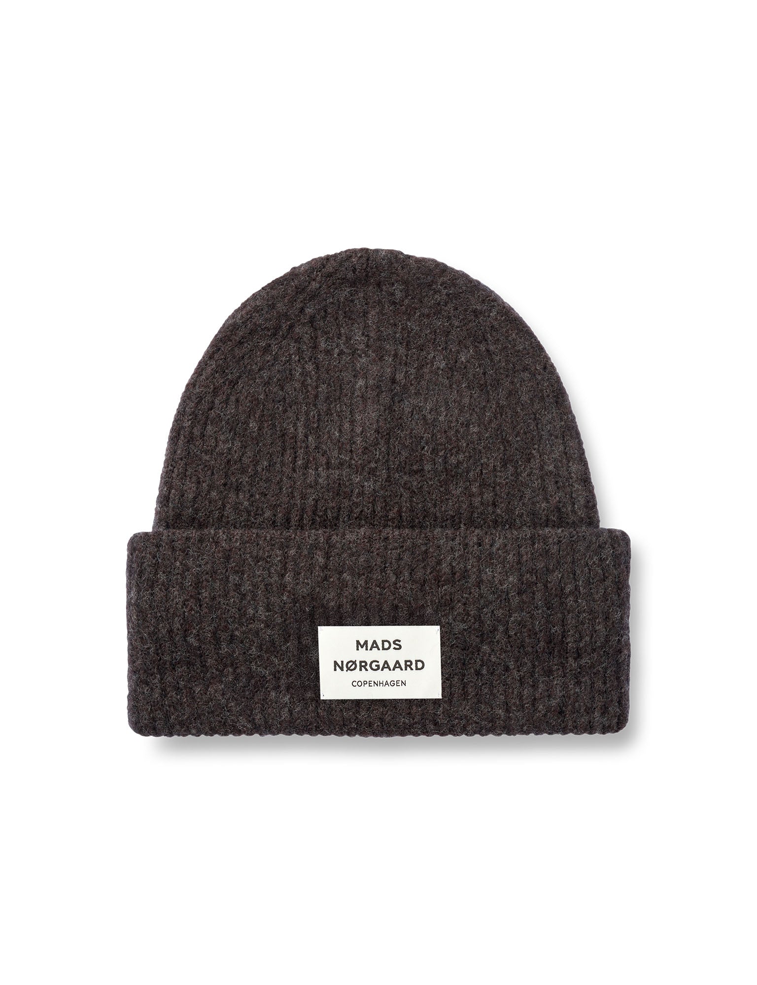 Blød, ribstrikket hue med bredt dobbelt-rib og påsyet logolabel.