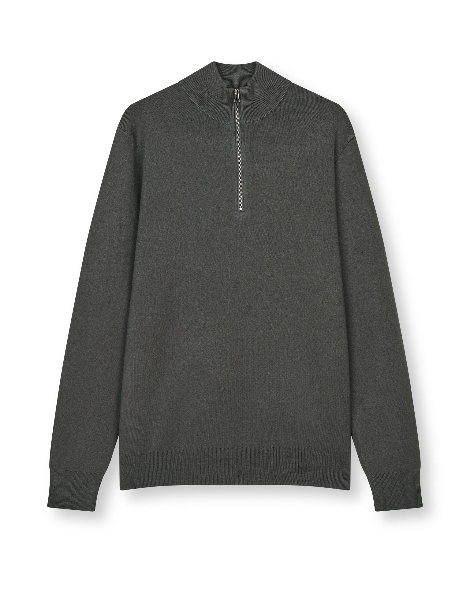 Helt glat og enkel striktrøje med høj hals med lynlås til midt på brystet og strikkede ribkanter.