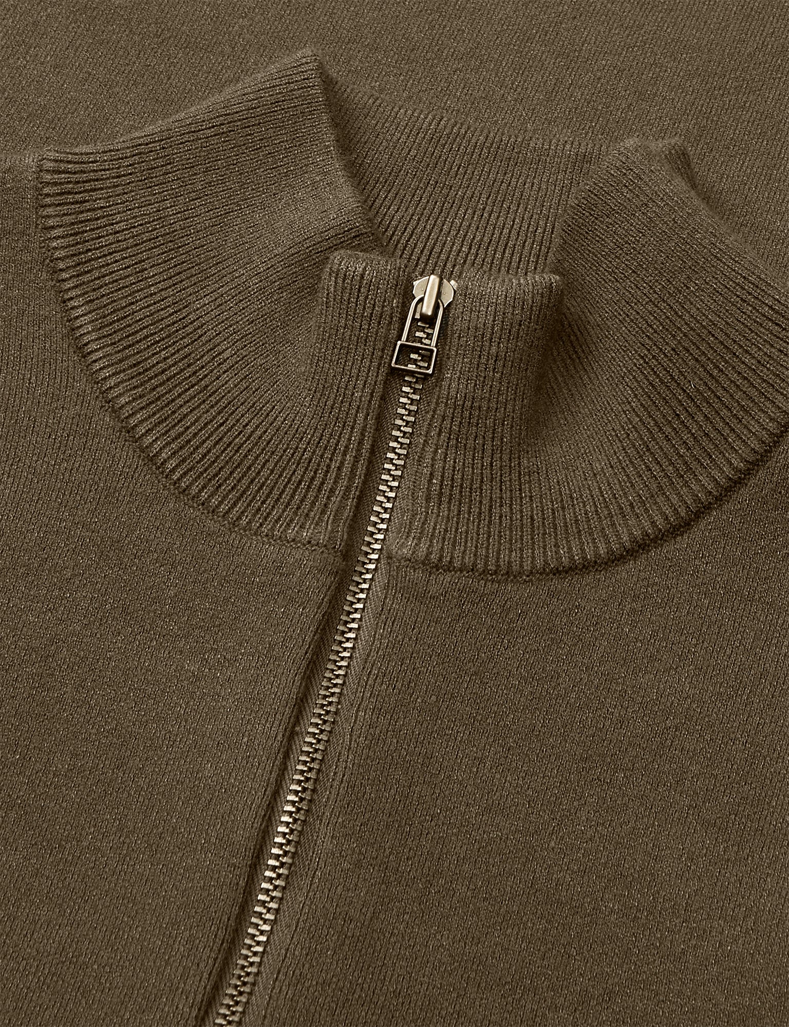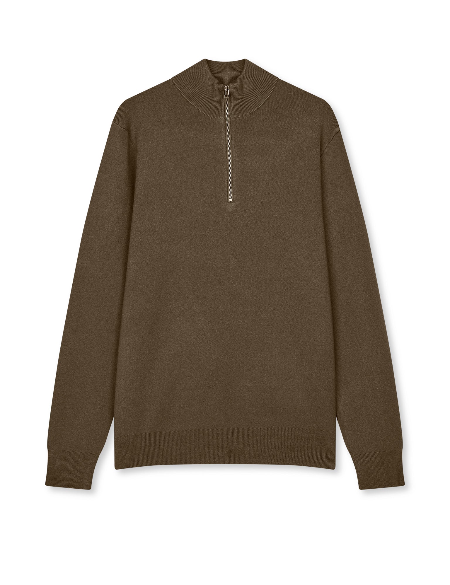 Helt glat og enkel striktrøje med høj hals med lynlås til midt på brystet og strikkede ribkanter.