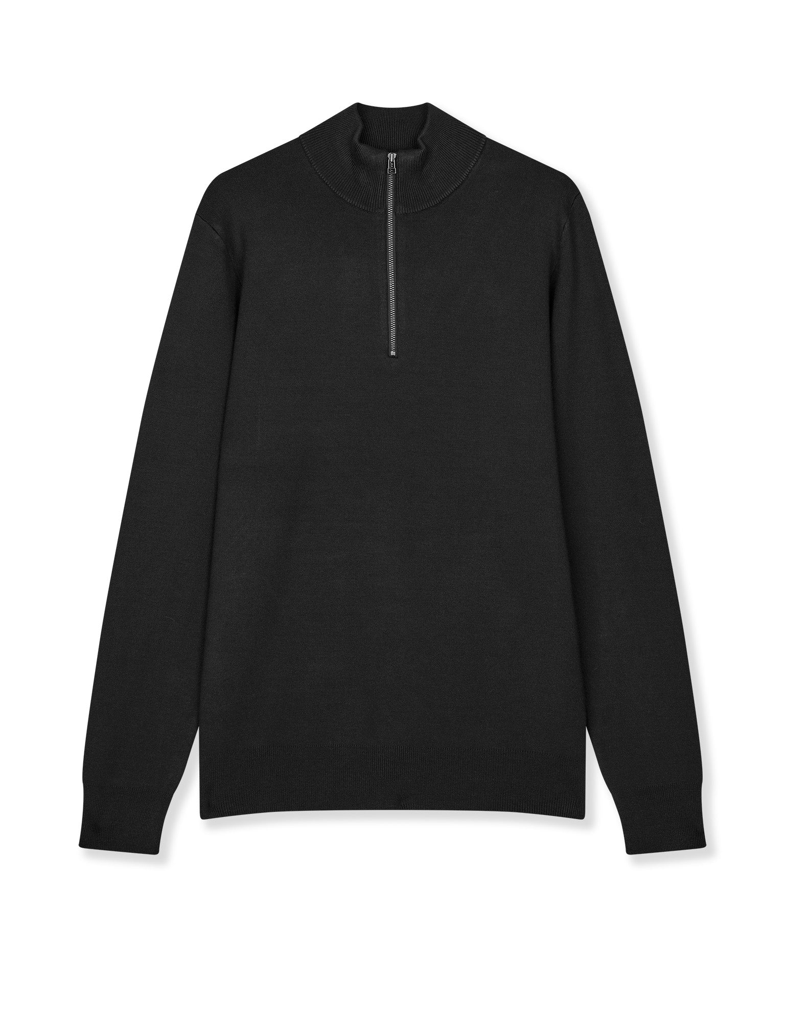 Helt glat og enkel striktrøje med høj hals med lynlås til midt på brystet og strikkede ribkanter.