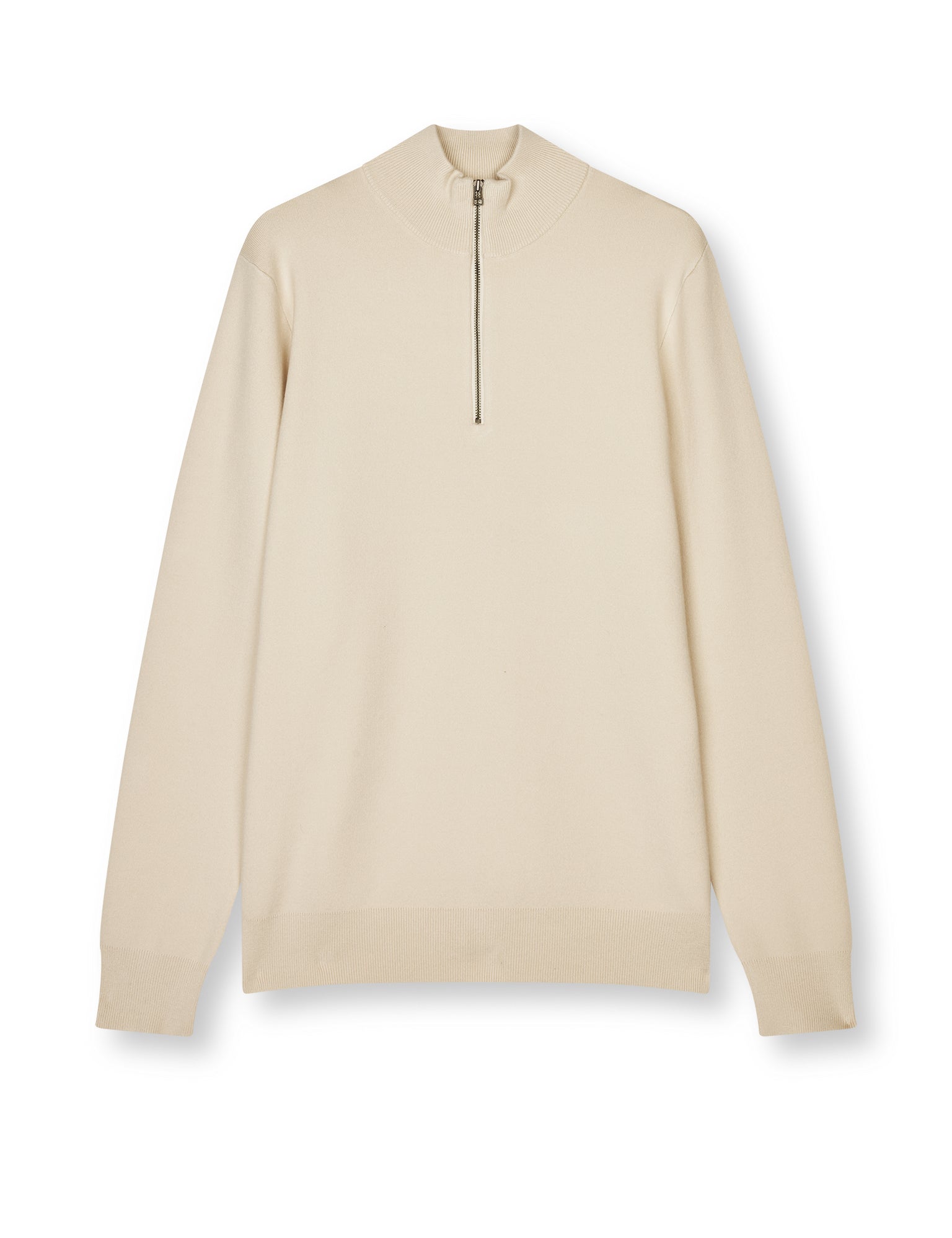 Helt glat og enkel striktrøje med høj hals med lynlås til midt på brystet og strikkede ribkanter.