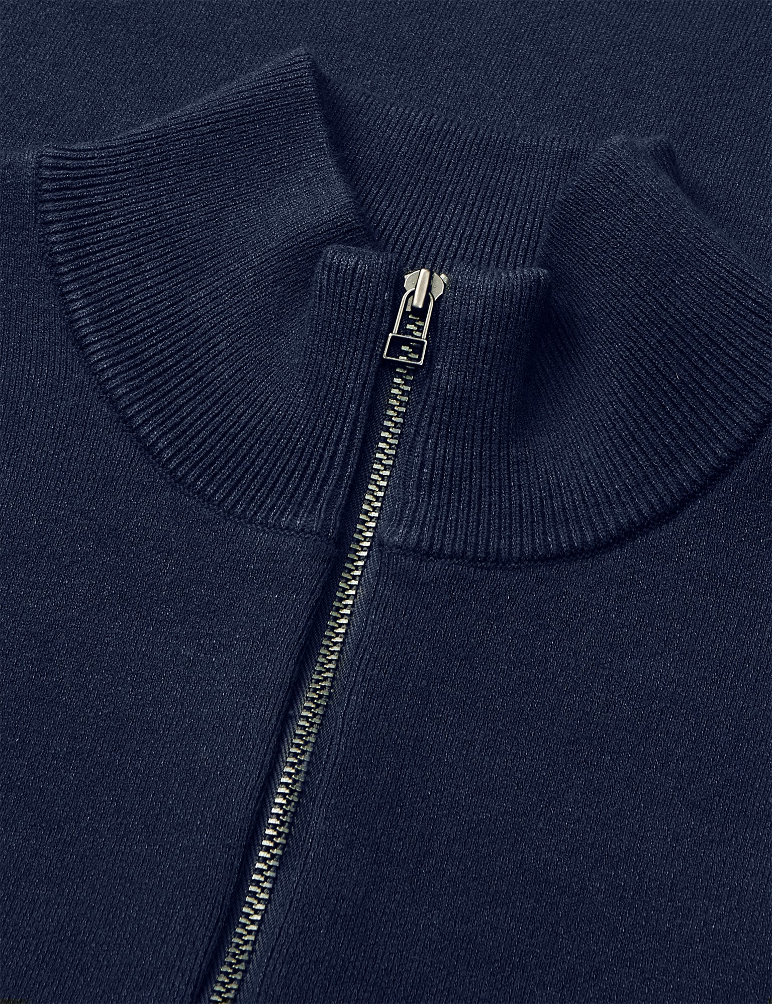 Helt glat og enkel striktrøje med høj hals med lynlås til midt på brystet og strikkede ribkanter.
