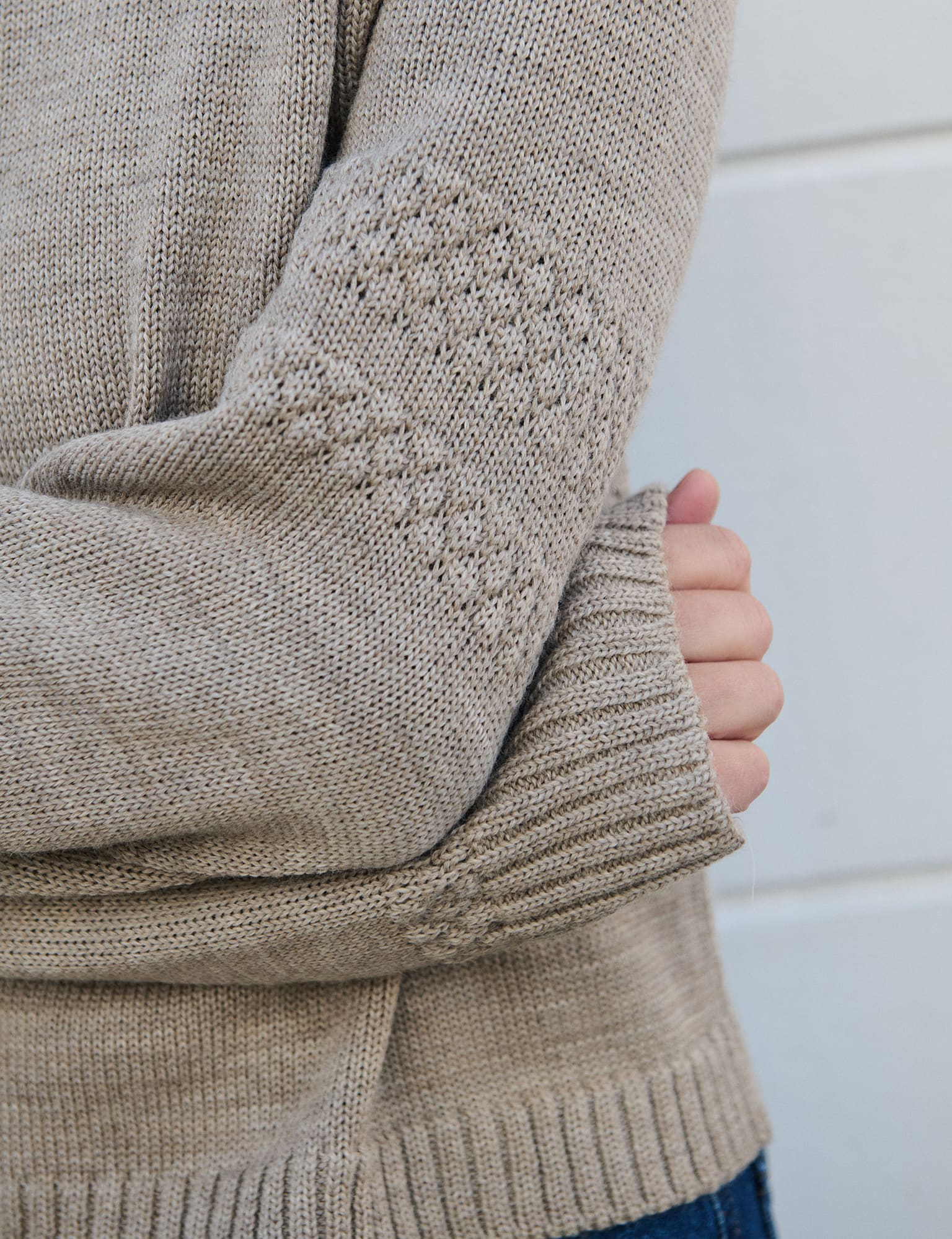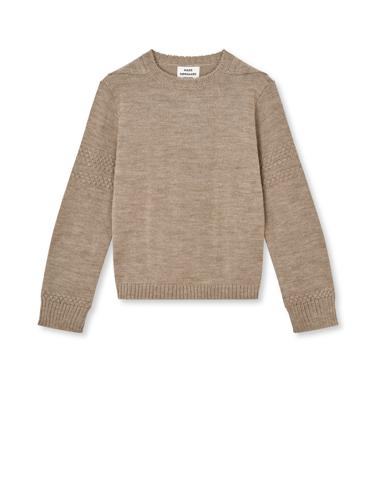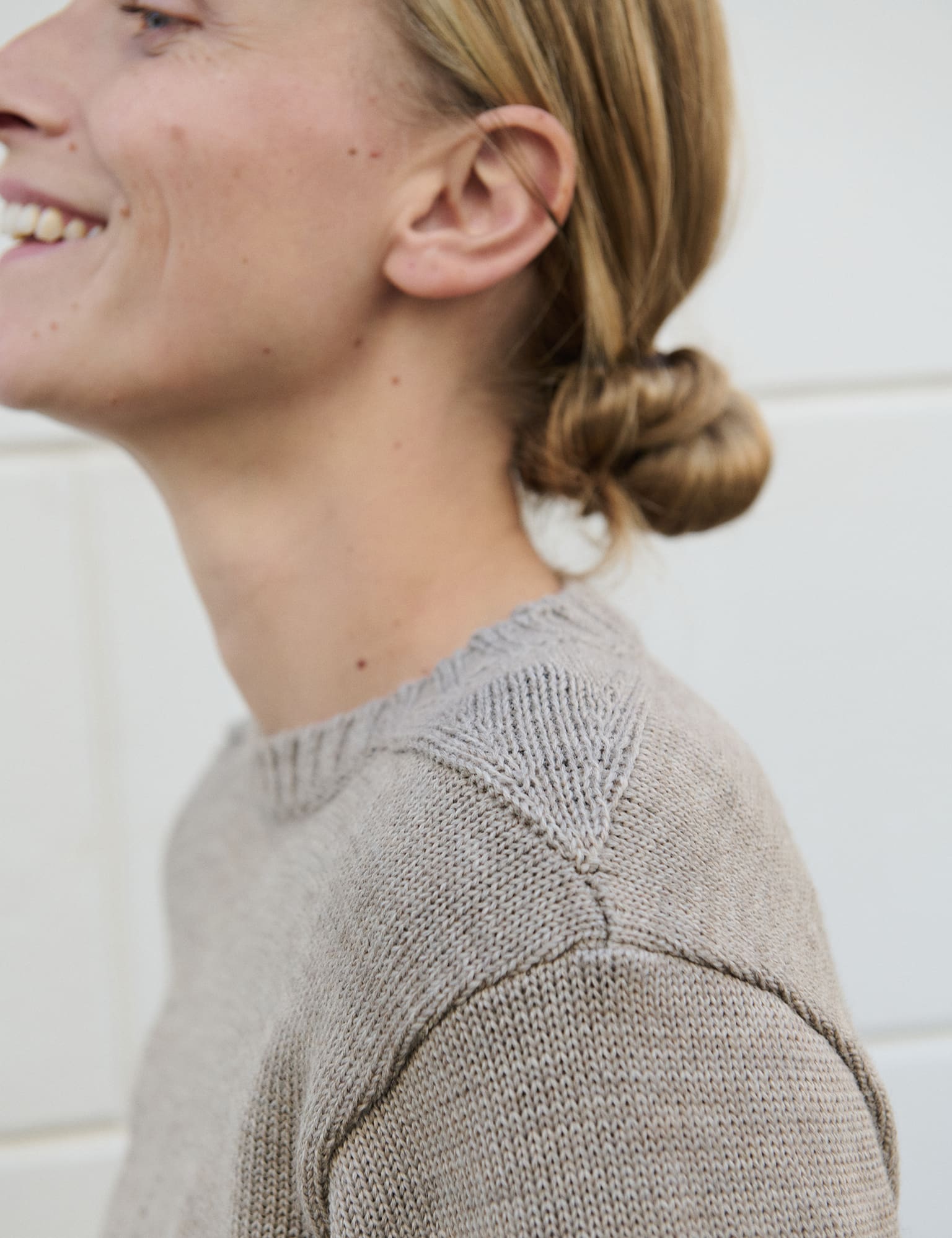 Kraftig striktrøje i sømandsstrik med kort liv, rund hals og lange ærmer.