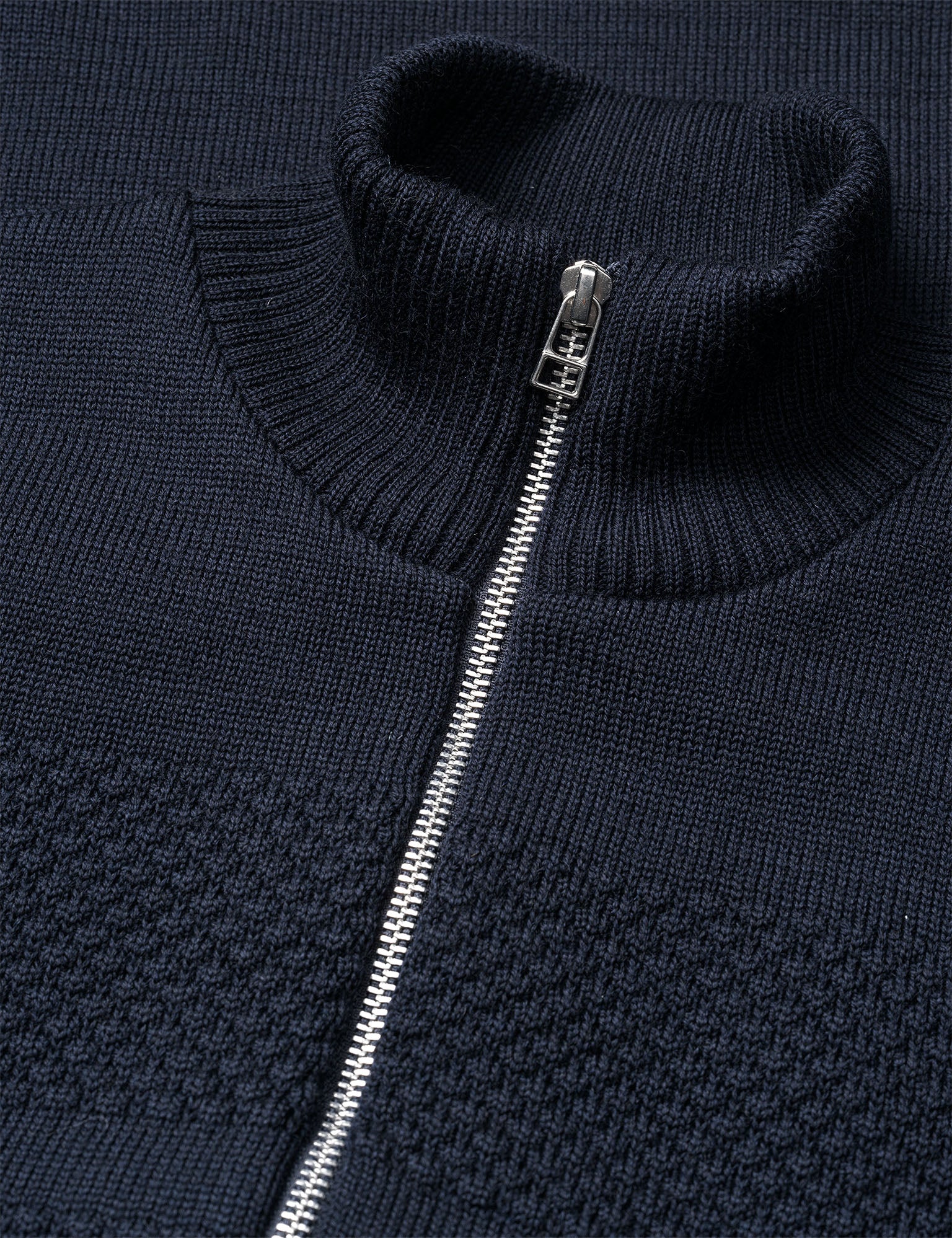 Kraftig sømandsstriktrøje med lynlås til midt på brystet, høj hals og lange manchetter med ombuk.
