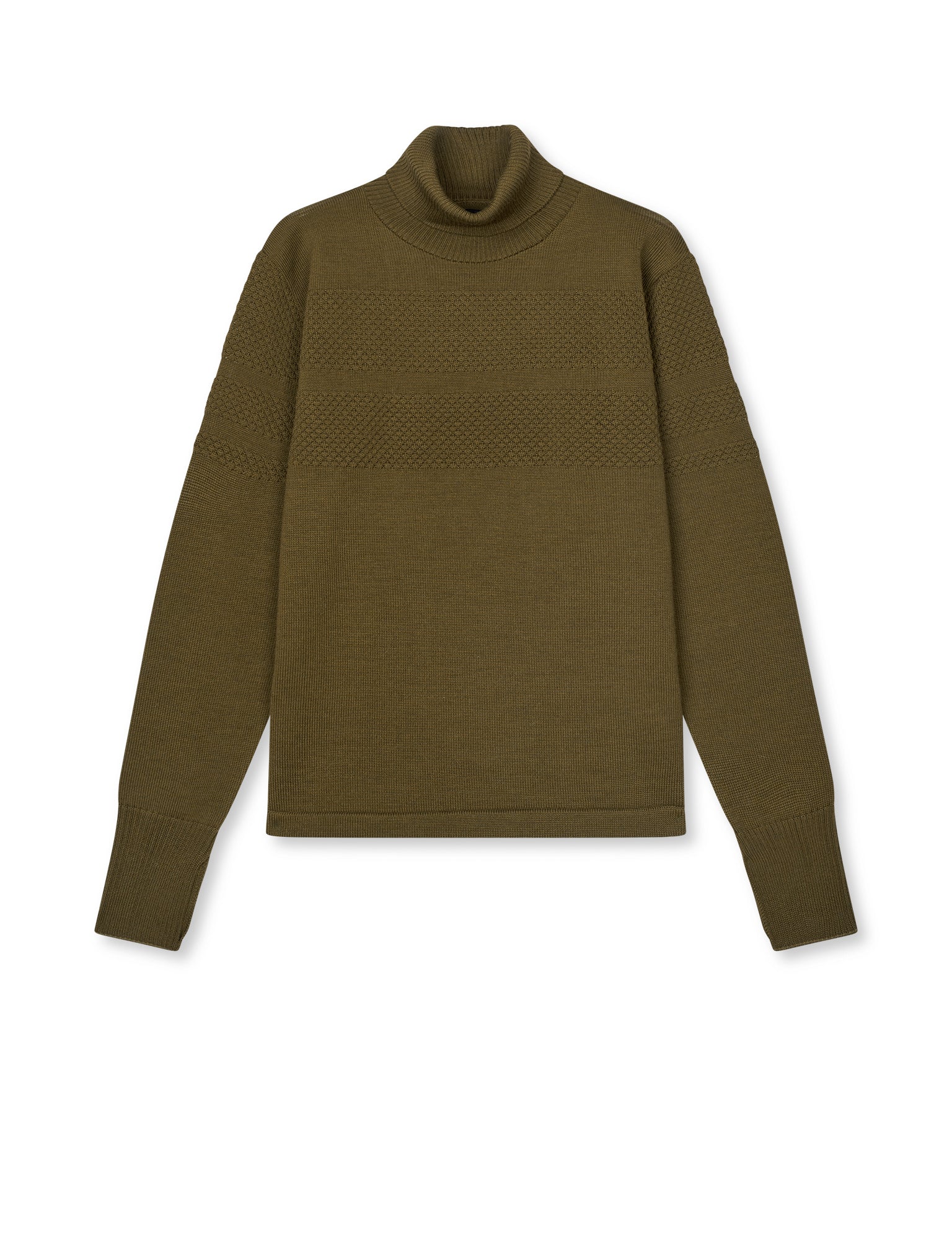 Vores all time-klassiker, striktrøjen Wool Klemens Knit, er lavet af 100 % uld. Den er strikket tæt, den er kraftig, og den er virkelig varm. Kanterne er ribstrikkede, halsen er høj, pasformen er tætsiddende, og stilen er sømand.