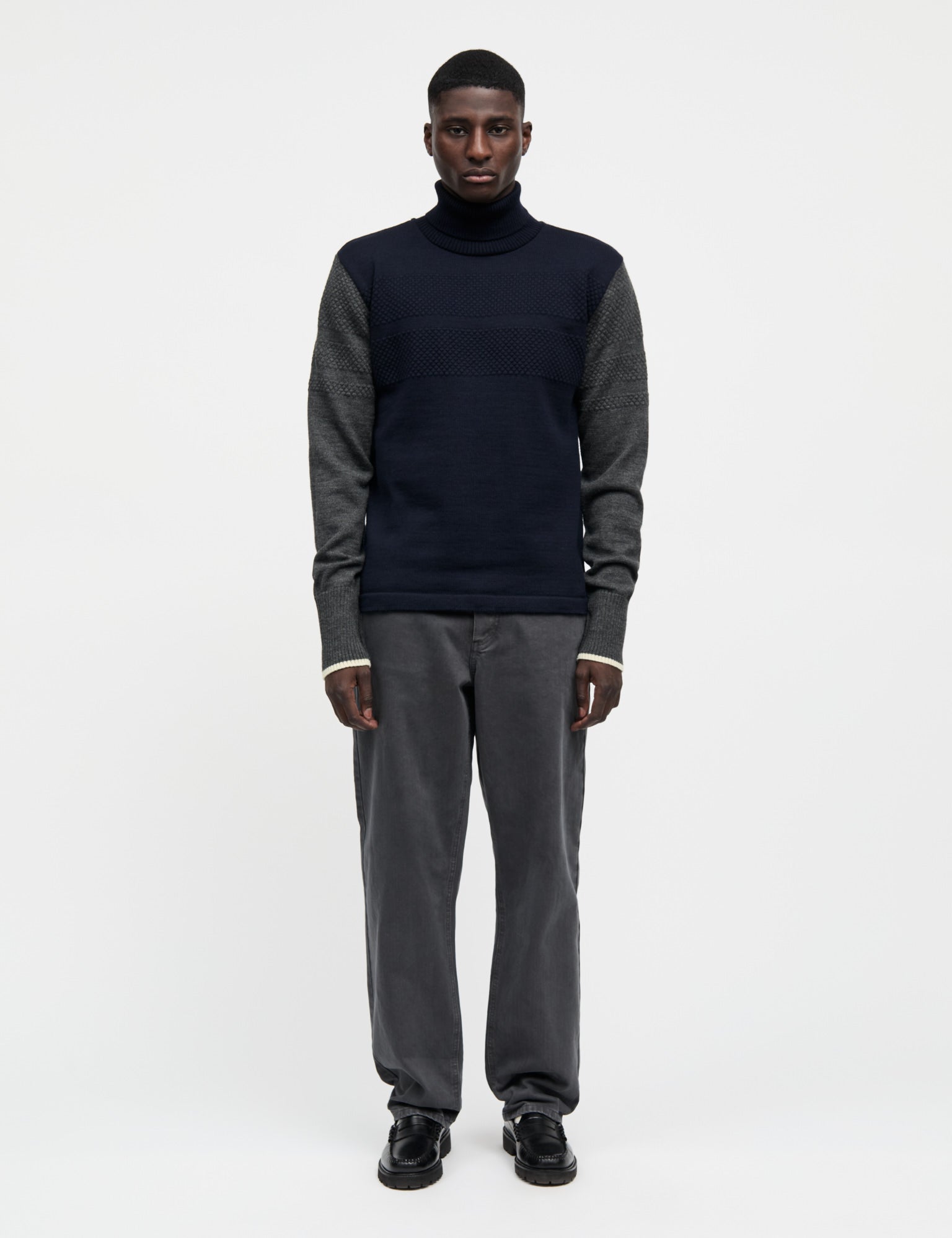 Vores all time-klassiker, striktrøjen Wool Klemens Knit, er lavet af 100 % uld. Den er strikket tæt, den er kraftig, og den er virkelig varm. Kanterne er ribstrikkede, halsen er høj, pasformen er tætsiddende, og stilen er sømand.