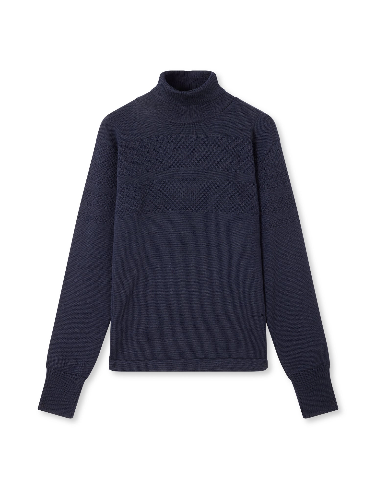 Vores all time-klassiker, striktrøjen Wool Klemens Knit, er lavet af 100 % uld. Den er strikket tæt, den er kraftig, og den er virkelig varm. Kanterne er ribstrikkede, halsen er høj, pasformen er tætsiddende, og stilen er sømand.