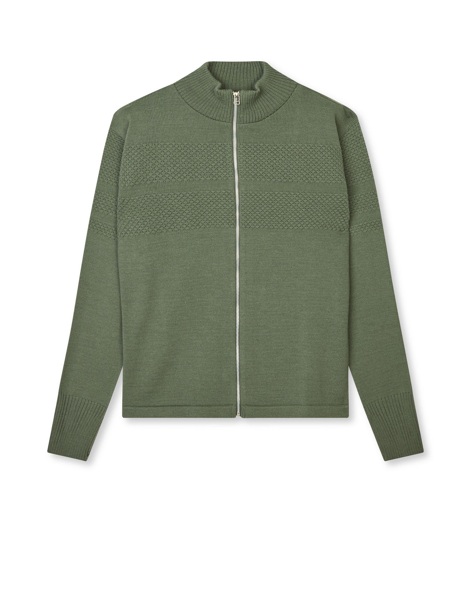 Vores all time-klassiker, strikcardiganen Wool Klemens Zip Knit, er lavet af 100 % uld. Den er strikket tæt, den er kraftig, og den er virkelig varm. Kanterne er ribstrikkede, halsen er høj, pasformen er tætsiddende, og stilen er sømand.