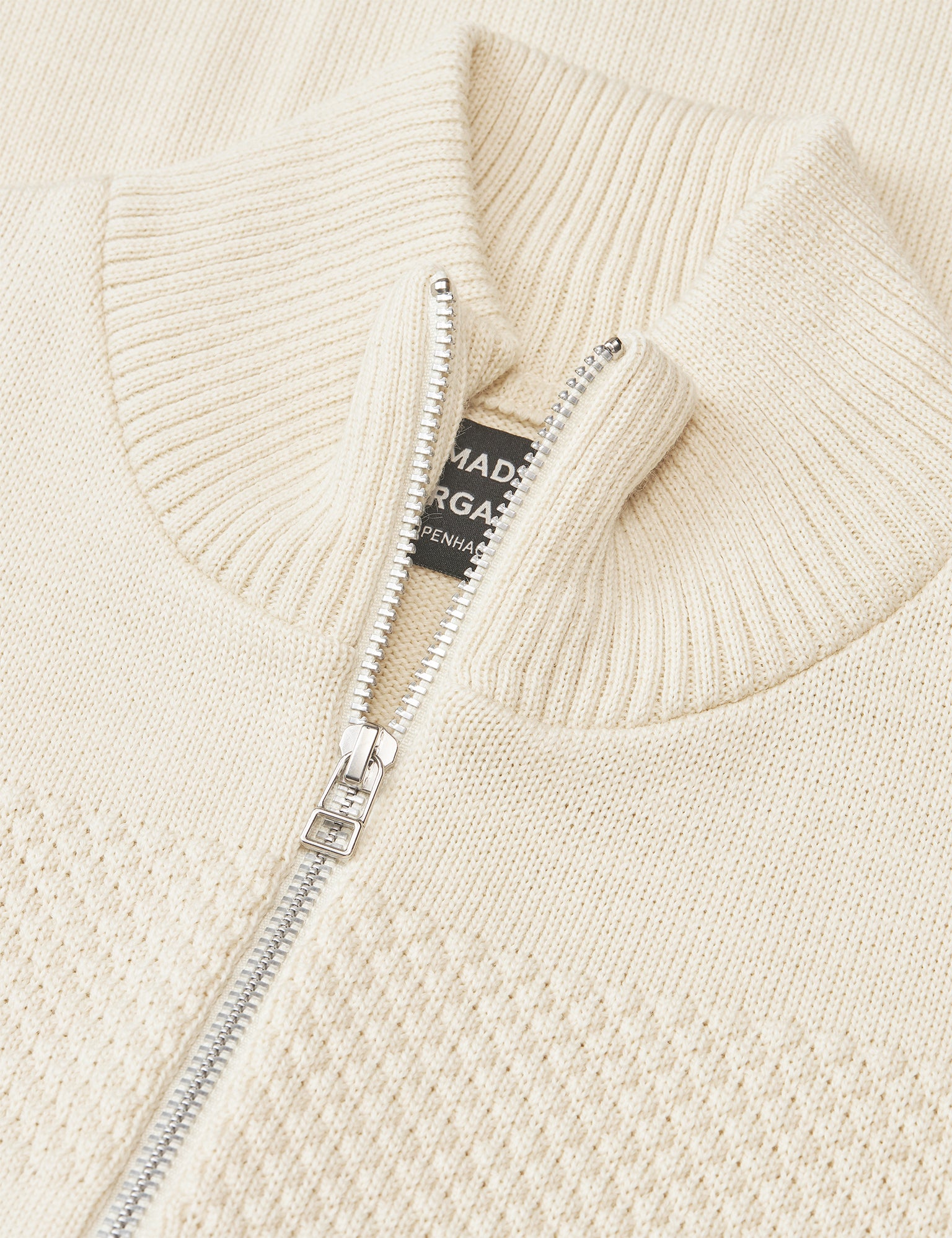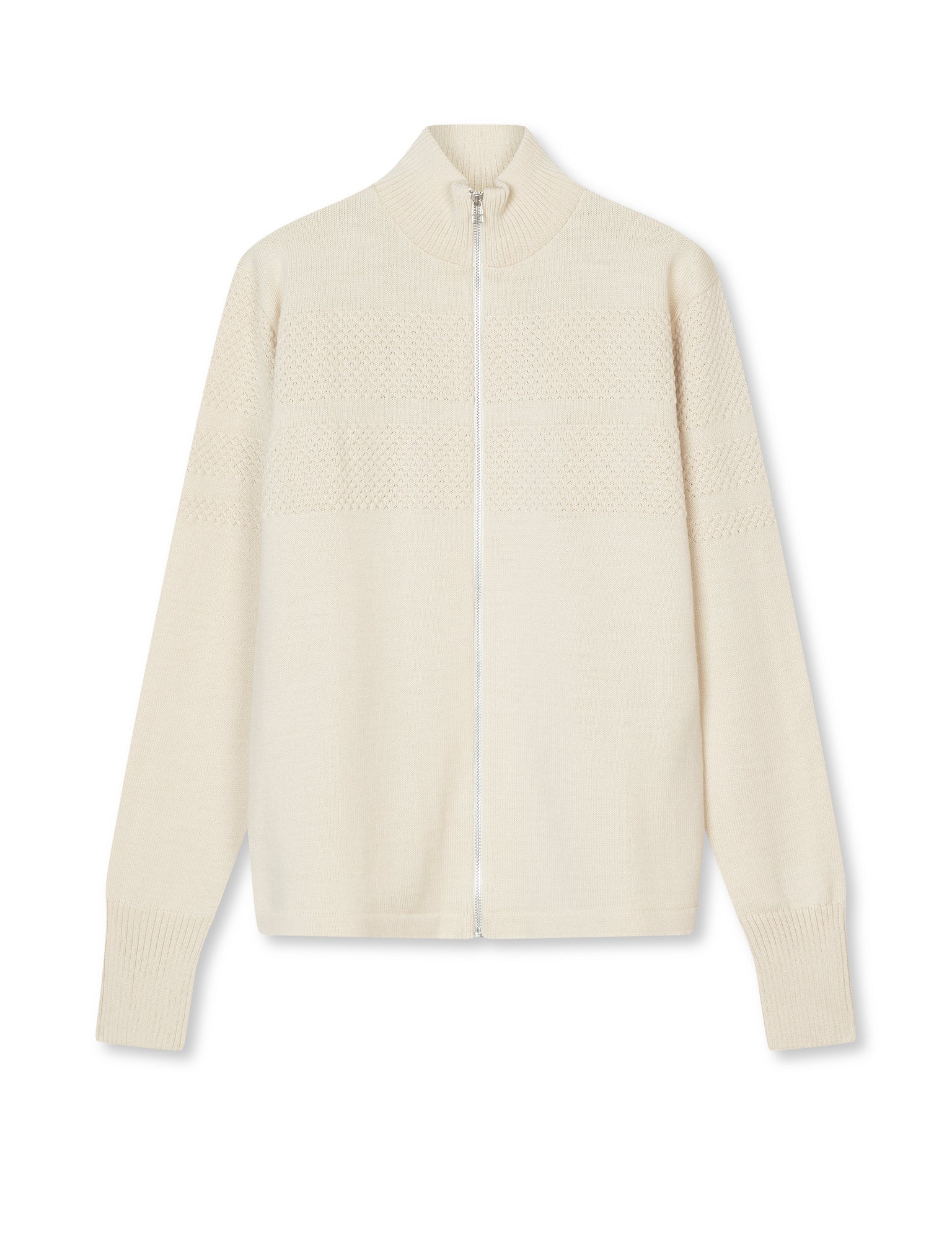 Vores all time-klassiker, strikcardiganen Wool Klemens Zip Knit, er lavet af 100 % uld. Den er strikket tæt, den er kraftig, og den er virkelig varm. Kanterne er ribstrikkede, halsen er høj, pasformen er tætsiddende, og stilen er sømand.