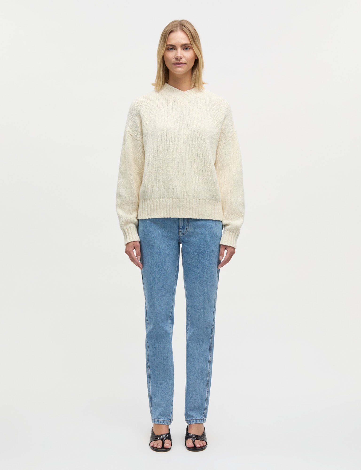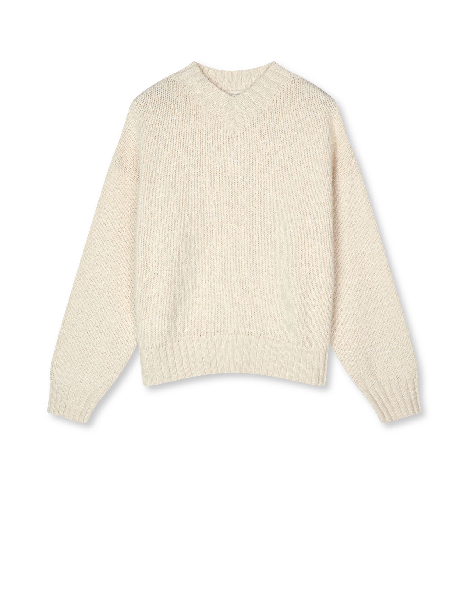 Langärmeliger Strickpullover mit V-Ausschnitt, lockerer Passform und Rippbündchen an Ärmeln und Saum.