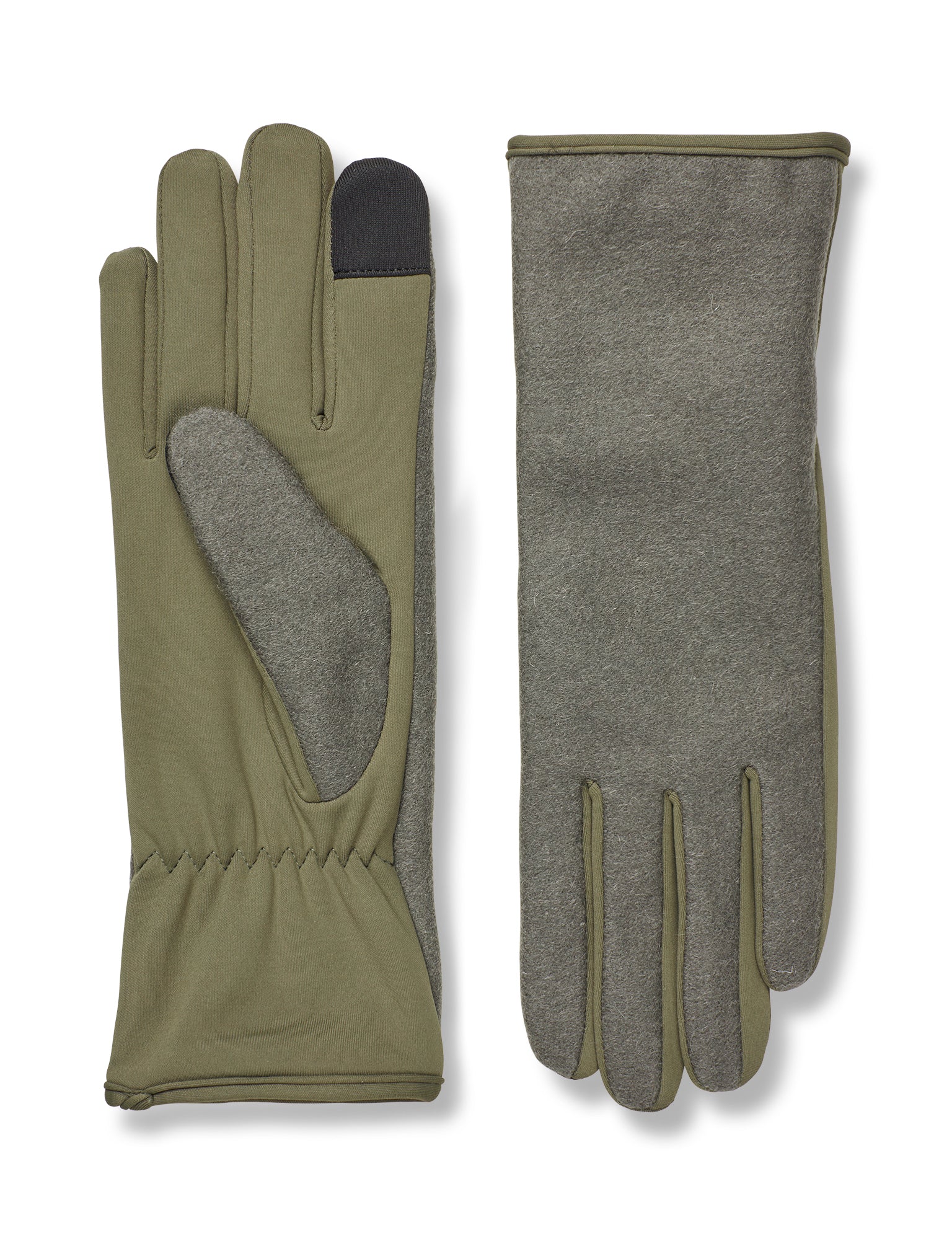 Handsker med filtet uld på håndryggen og blødt, fleksibelt stof på håndfladen. Og en finger med modstand til fingertouch på mobilen.