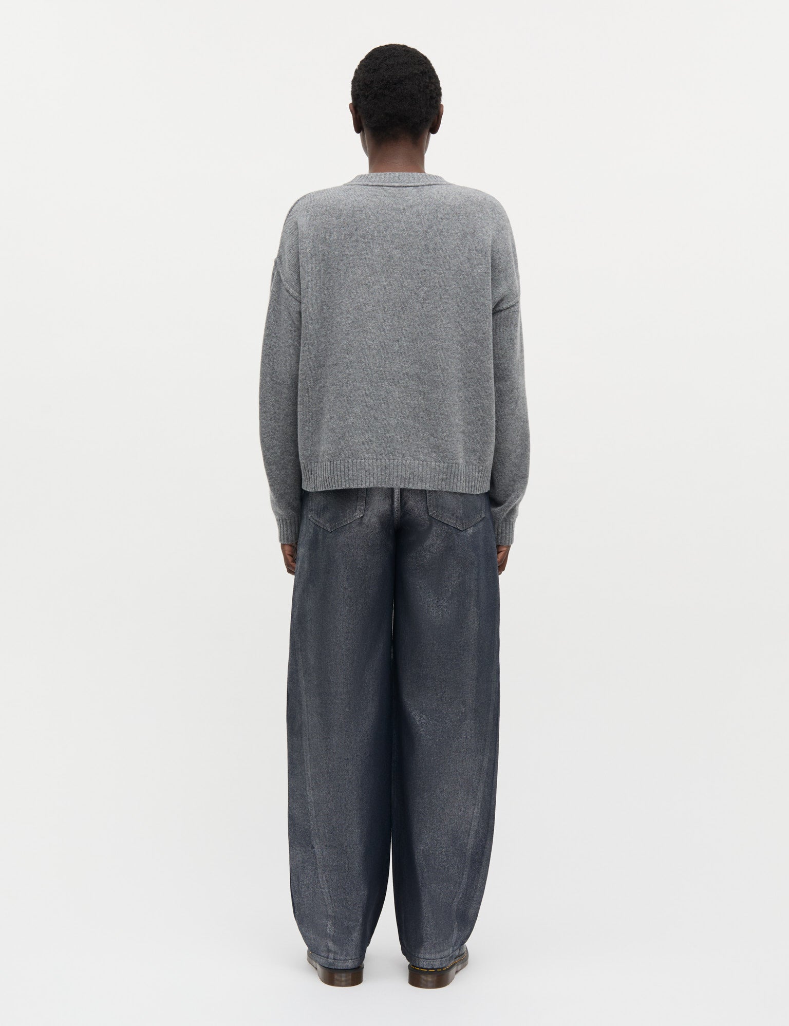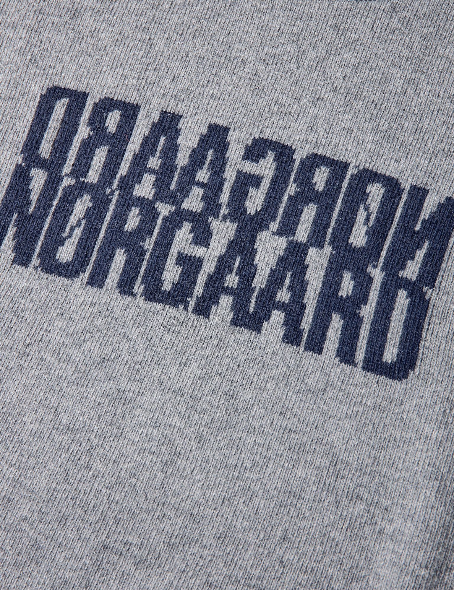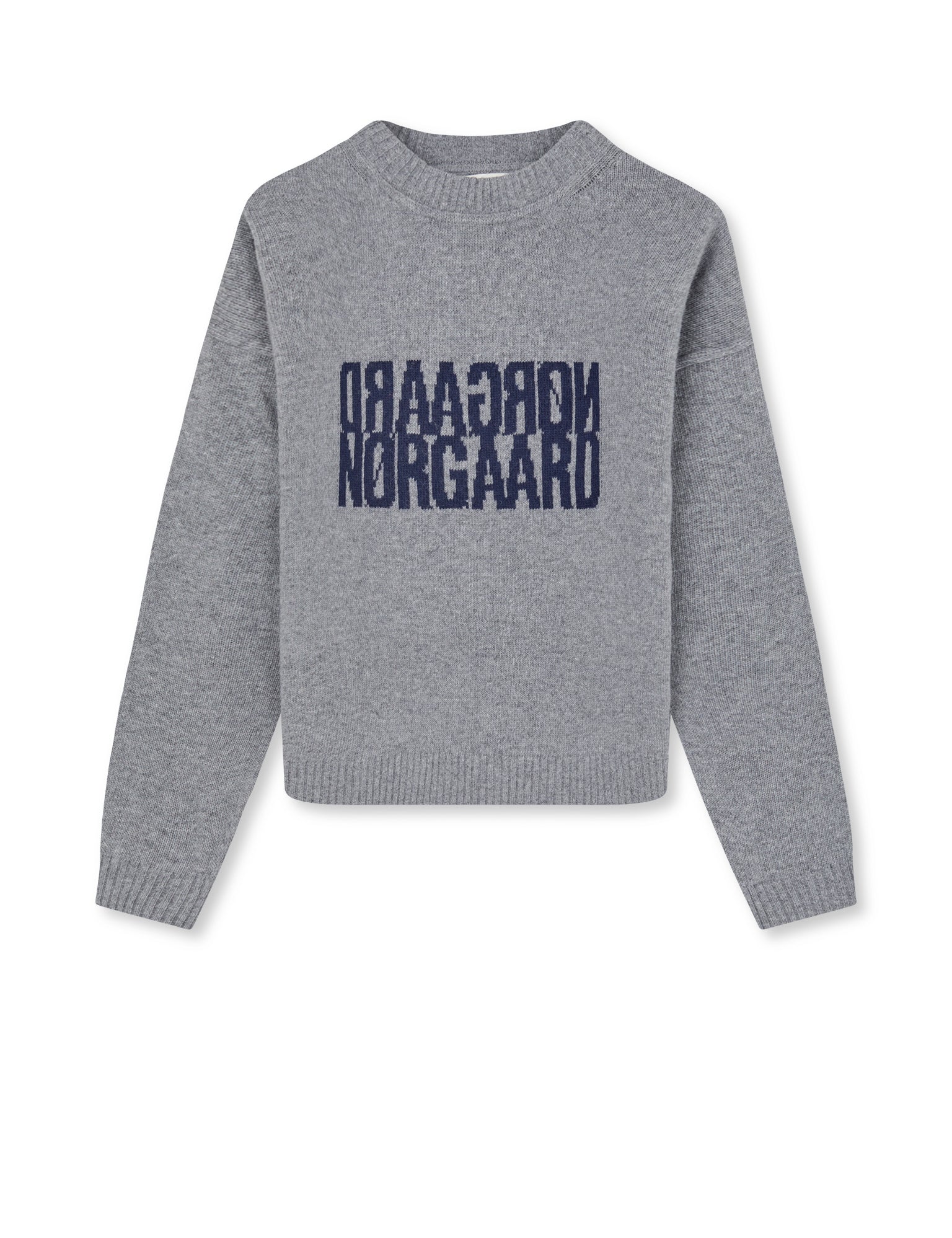 Loose striktrøje med hængende skuldre, lange ærmer, brede ribstrikkede kanter og delvist spejlvendt logo strikket på brystet.